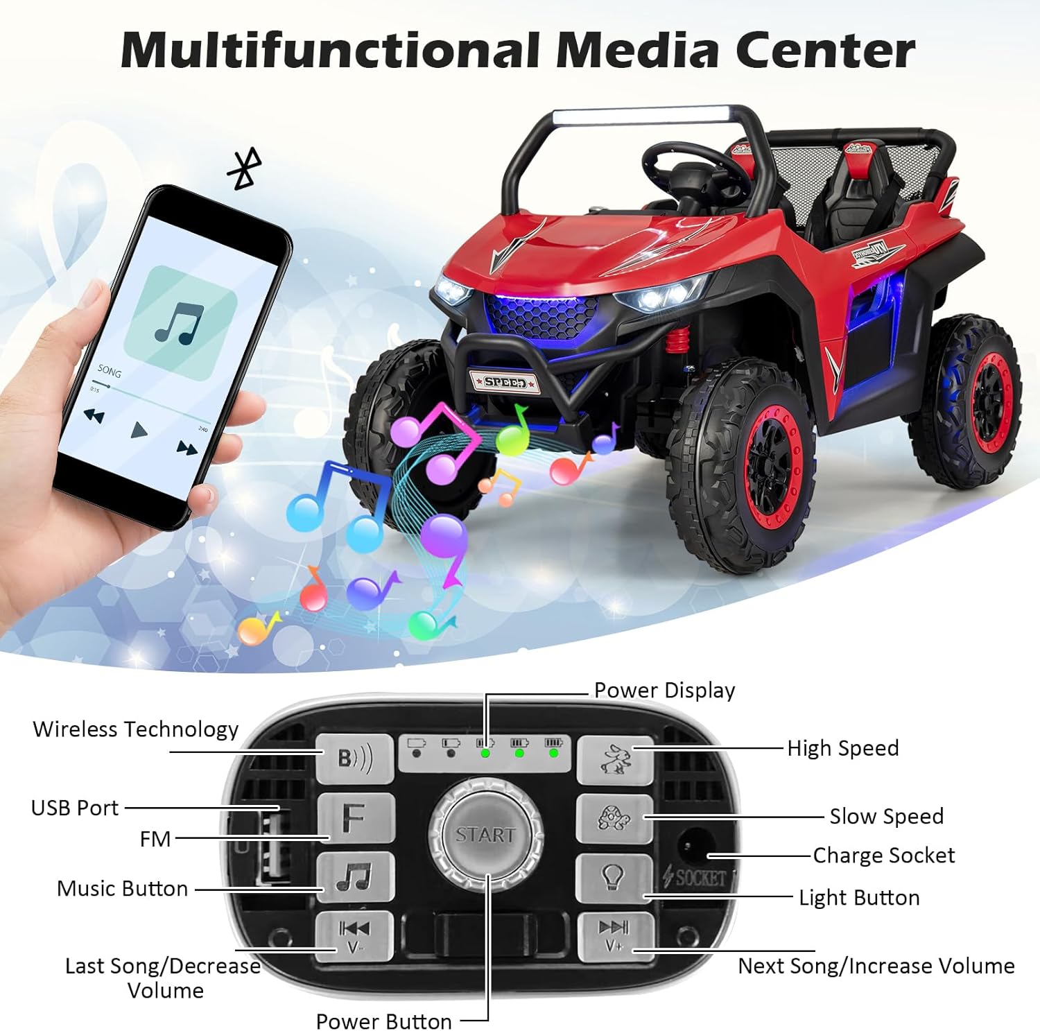 - 【4 Audio Sources & Realistic Design】 There are several built-in songs to cheer up your kids. Besides, wireless technology allows you to have this kids UTV play your child's favorite music for them. The USB port and radio providing more audio sources. The one-button start, forward / reverse direction, battery display and lockable doors bring a realistic driving experience.
