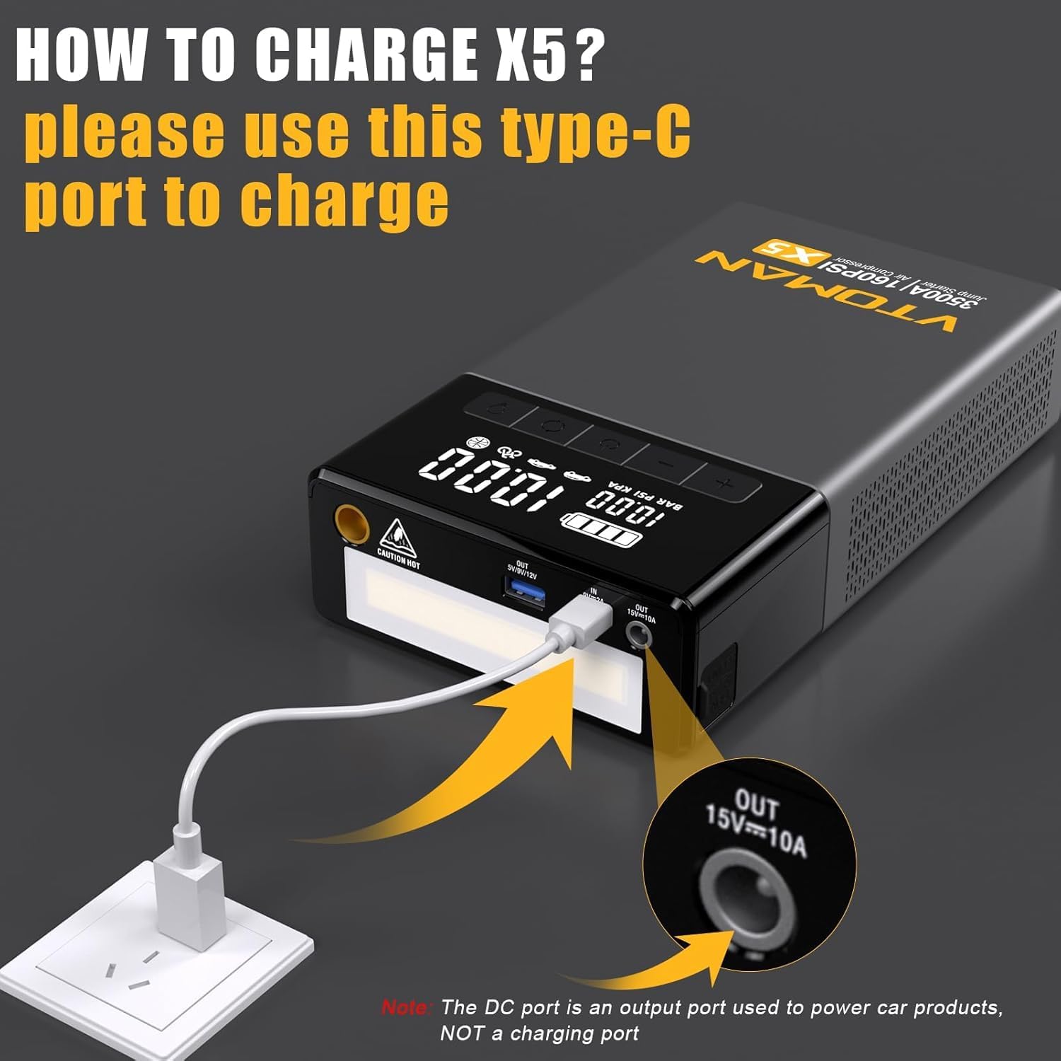 - *Note:Type-C is the only input charging port. The DC output port is used to power car products such as car vacuum cleaners, not an iutput port. Please use type-C cable to charge. Improper charging may cause safety issues.