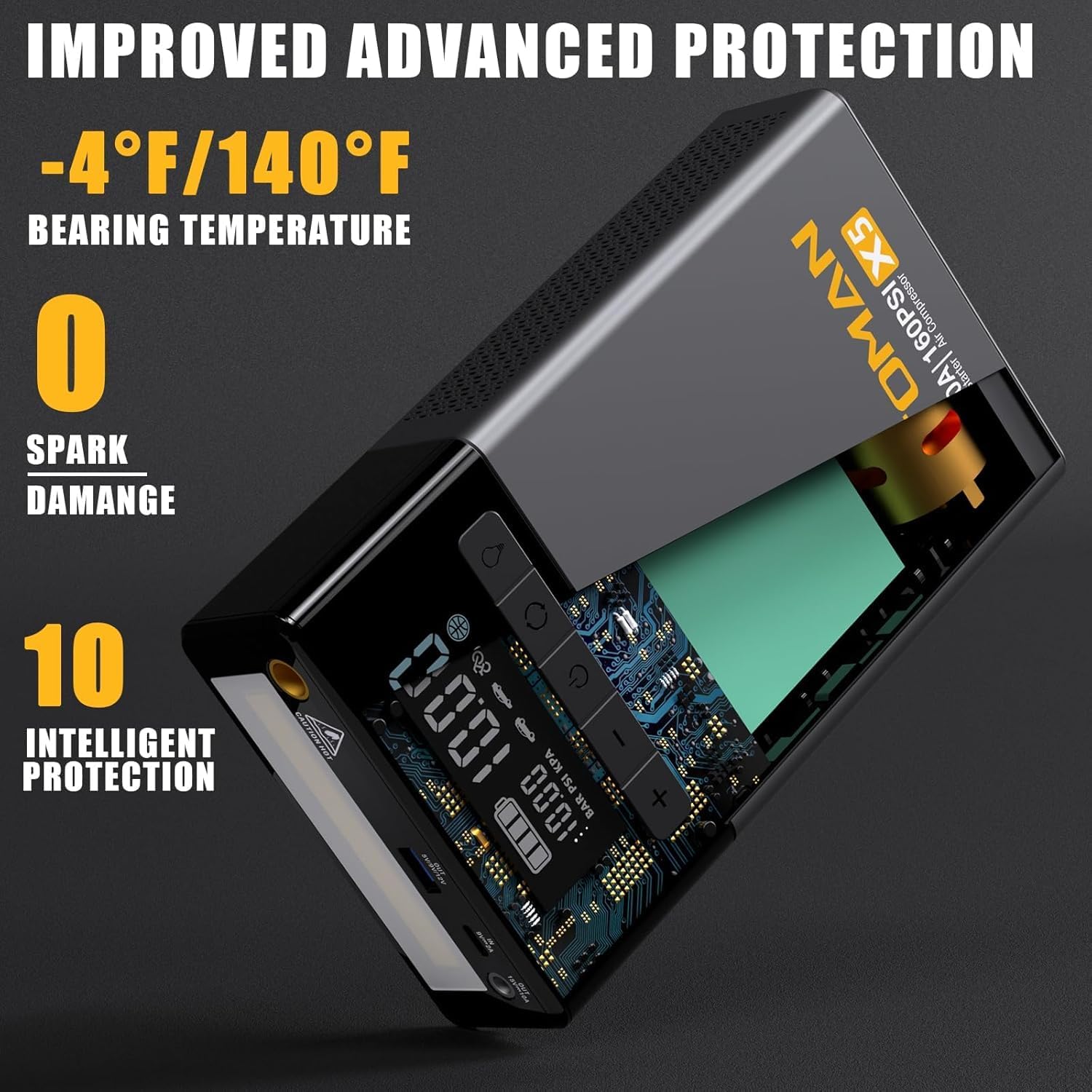 - Upgraded Thermal Design - The X5 battery booster pack features an upgraded thermal design that ensures cool operation even during prolonged use. This advanced design prevents overheating, ensuring optimal performance and durability over the long term, even in extreme weather(-4β to 140β).