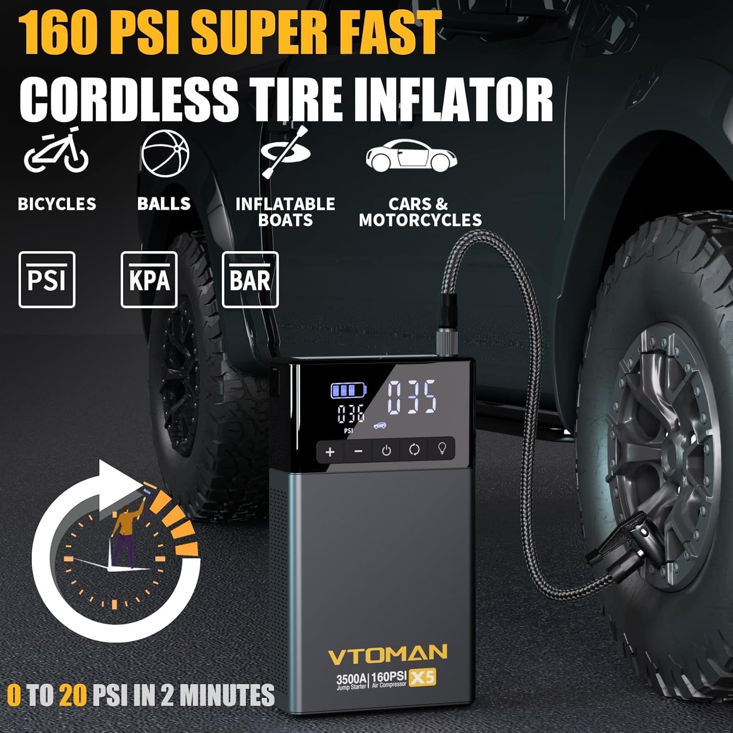 - 2 Mins Super Fast Inflation - The VTOMAN X5 car battery charger jump starter equipped with an 160psi digital air compressor that can inflate a typical car tire to 20 PSI in just 2 minutes, 2 time faster than others. Additionally, the X5 features real-time tire pressure detection and an auto shut-off function when the set PSI is reached. The set also includes an extension air hose and 3 different nozzles, allowing you to inflate cars, bikes, balls, mattresses, pool floats, etc.