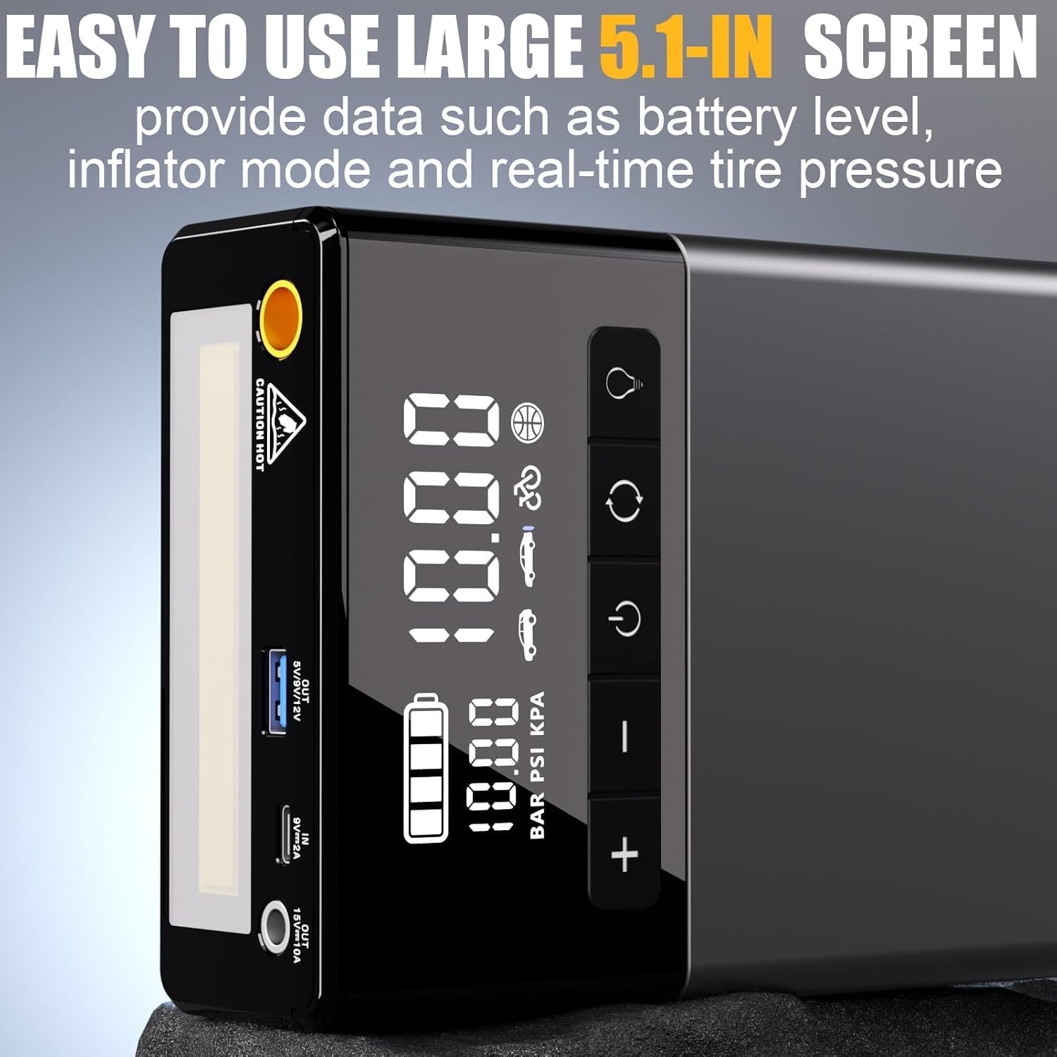 - Large 5.1-Inch Smart Screen - Unlike traditional jump starters that only have analog indicators, the X5 jump starter for car battery boasts a large and intelligent 5.1-inch smart screen. This display provides vital information such as battery level, inflator mode, inflate volume, and tire pressure in 3 units (psi, bar, kpa), making it more easier and clearer for you to use.
