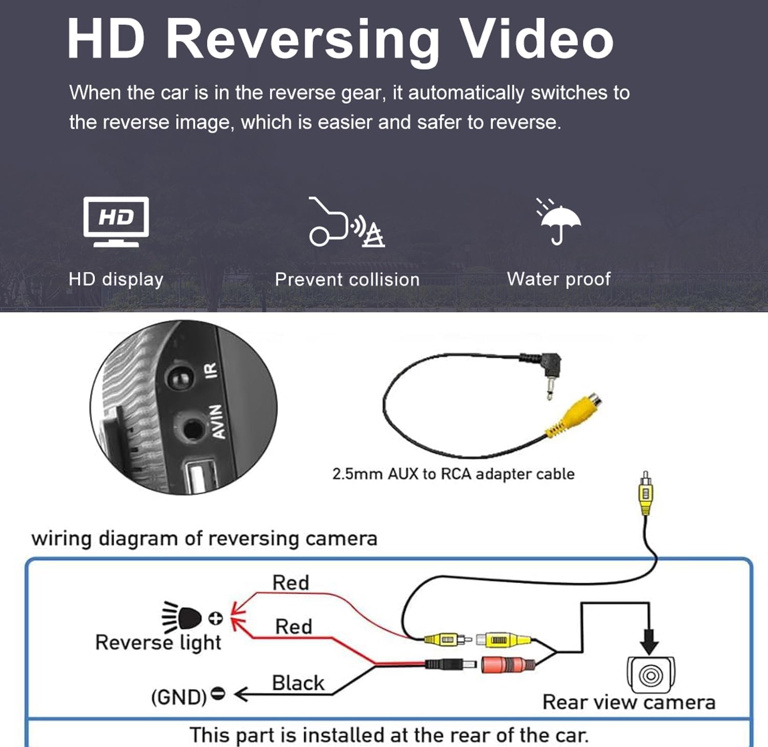 - REAR VIEW CAMERA: The portable car stereo is equipped with a waterproof AHD night vision backup camera. When the vehicle shifts into reverse, the car stereo screen will automatically display the reverse image and traffic condition, make your daily reversing safer and more convenient
