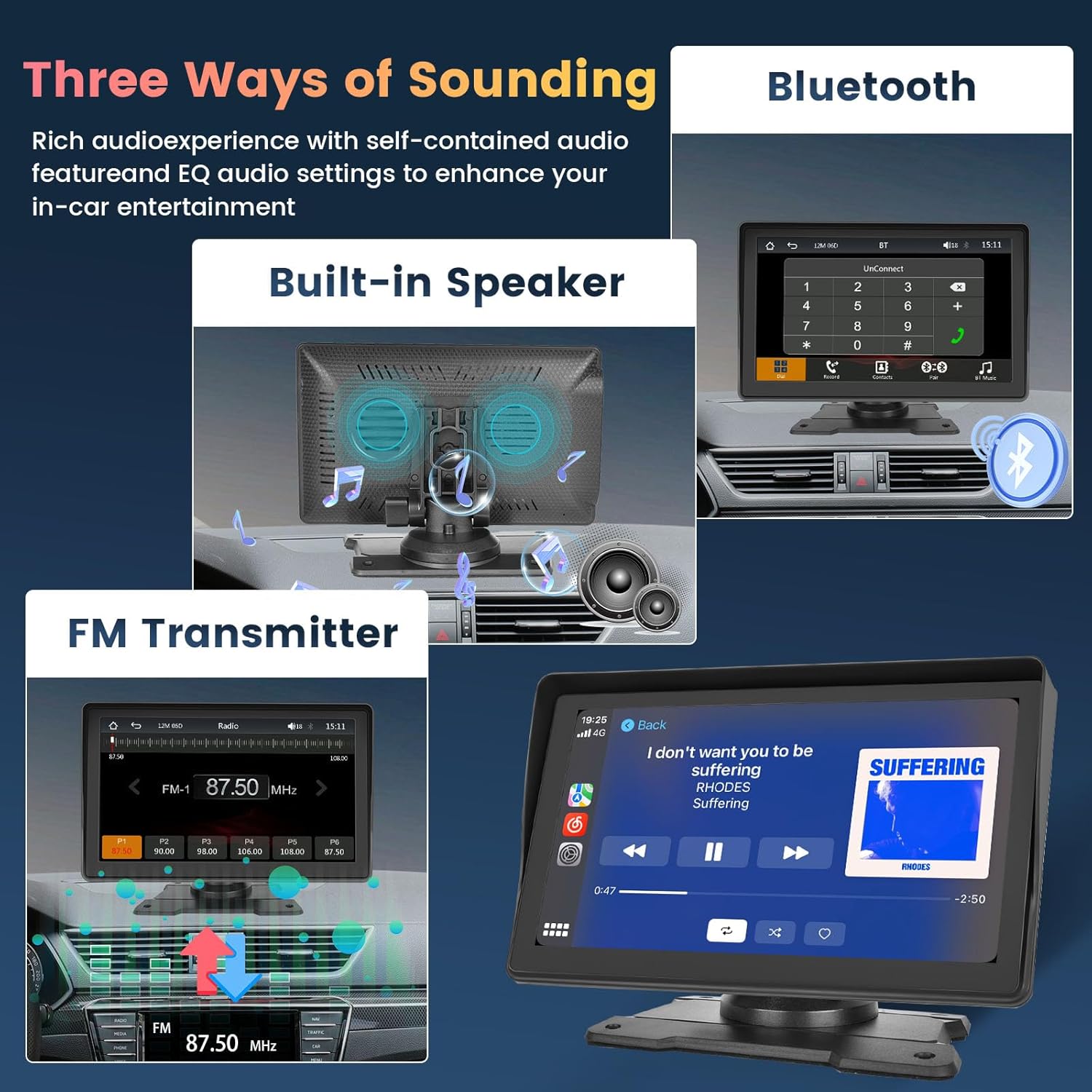 - BLUETOOTH, FM, BUILT-IN SPEAKER: Portable carplay with Bluetooth supports hands-free calling, phonebook download and music playback. Android auto screen with built-in speaker provides hearing sound effect. You can get a louder sound from your car stereo by using FM transmitter. Keep apple car play and your own car radio at the same channel, and you can easily transfer the audio.