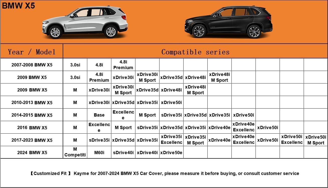 - ăSuitable forăâ Custom fit for BMW X5 (2007-2025). Come with a large enough portable bag to store your cover when you do not use