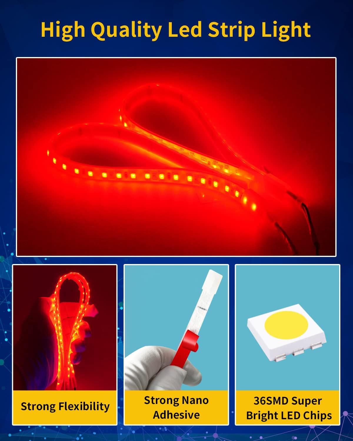 - 【Easy to Install】Our motorcycle led strip lights Red waterproof back with Strong Nano Tape and has 100cm length lead wire. Red wire connect to positive (+), Black Wire Connect to Negative(-). Simply stick the strip light to a dry,clean surface for use for your DIY lighting needs. No need drill some hole.