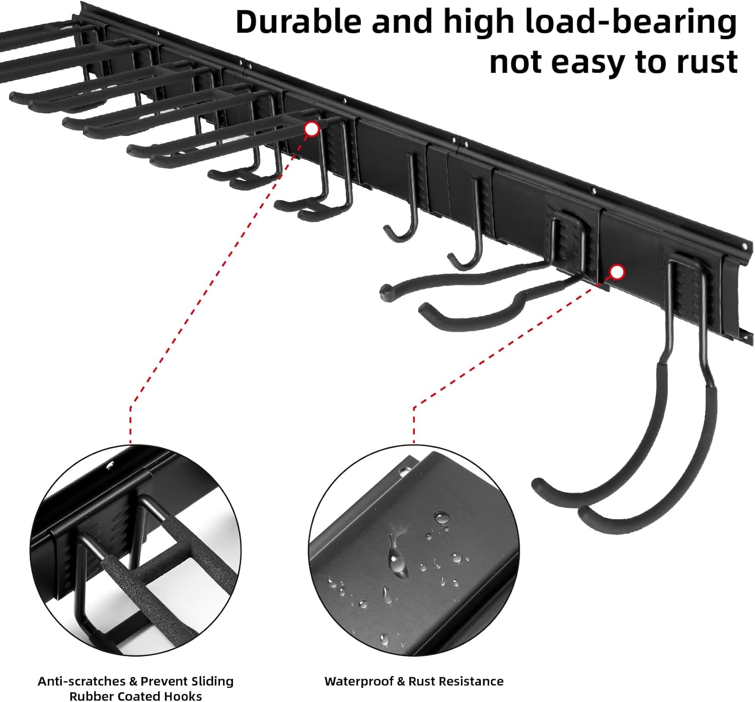 - The wall mount tool storage rack is made of high-strength steel, and all hooks are wrapped in rubber to prevent slipping and damage to your tools. Durable and sturdy, with a load capacity of up to 300 pounds, making it easy to hang heavy tools. Indoor and outdoor surface anti-corrosion treatment, no need to worry about sun, rain, and aging.
