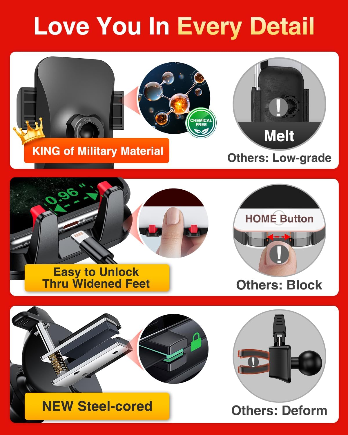 - 【💯Humanized Details-Integrated Molding, Data Safety Pledge】1️⃣Integrated molding bracket ensures the best support&data safety assurance, superior to those flimsy ones; 2️⃣ The ideal bottom tray wide: 0.96in-from our customers' voice, compatible all kinds of charging cables; 3️⃣Back release button has been tested to be the quickest way, smooth 1s picking and placing;