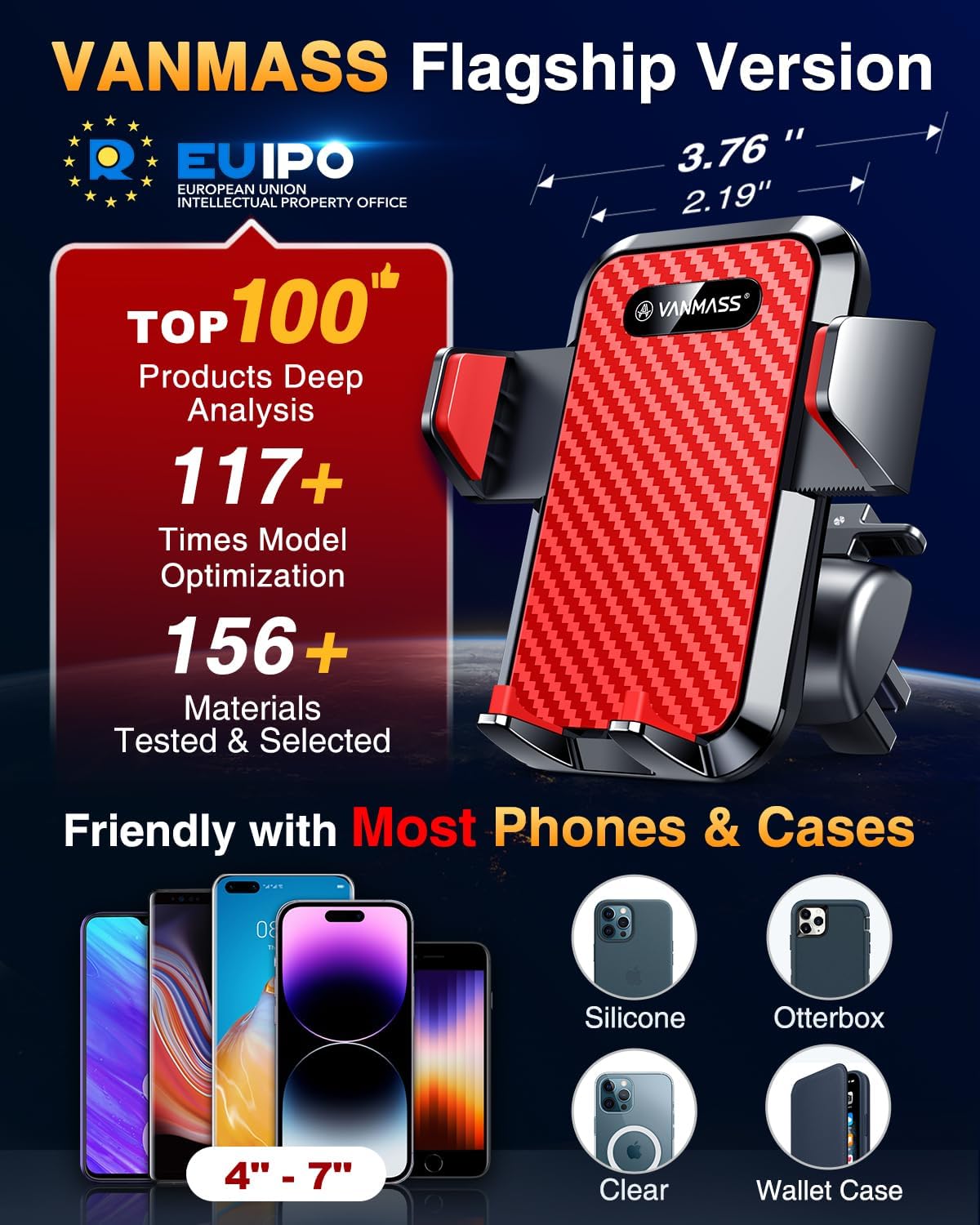 - 【🥇BEST Newest Car Phone Holder】VANMASS's best car phone mount with the highest rating! Preferred by 3,500,000+ Customers; Designed by world-class professional team; enjoy EUIPO Patent (No.007708805-0001), Military-grade certificate (No. GZMR220601855501), CP65/REACH/ROHS; 4,000+ kinds of material selection, 500+ suction cup upgrade designs, and 20,000 miles of road tests; giving birth to the best combo of the Flagship&Classic hoolder with newest suction cup;