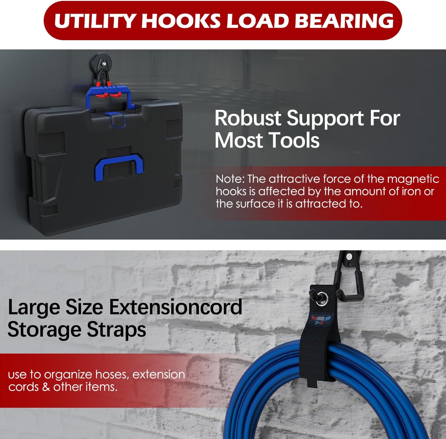 - Versatile and Effortless Installation: Enjoy the ease of our robust heavy duty hooks, offering two flexible usage options: (1) Perfect for metal surfaces, these garage magnetic hooks adhere simply without tools or drilling, ensuring no damage to the surface. (2) For enhanced versatility, the magnet can be detached, allowing independent use of the garage storage hooks. To securely store heavier tools, we provide robust screws that allow for a stable installation on multi-wall surface