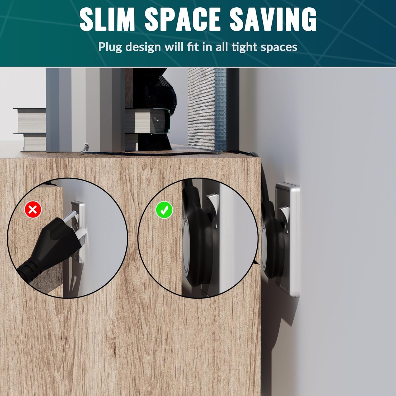 - ¡¾Flat Plug Design & Space Saving¡¿With only a 0.35-inch ultra flat plug design, Elecan upgraded flat wall plug is thinner than the regular flat plugs, which makes the best use of your outlets! The 45¡ã angled plug prevents other outlets from being blocked. It can easily fit in tight spots and hide behind like furniture, bookshelves, desks, or anything close to the wall, sitting flush against the wall completely.