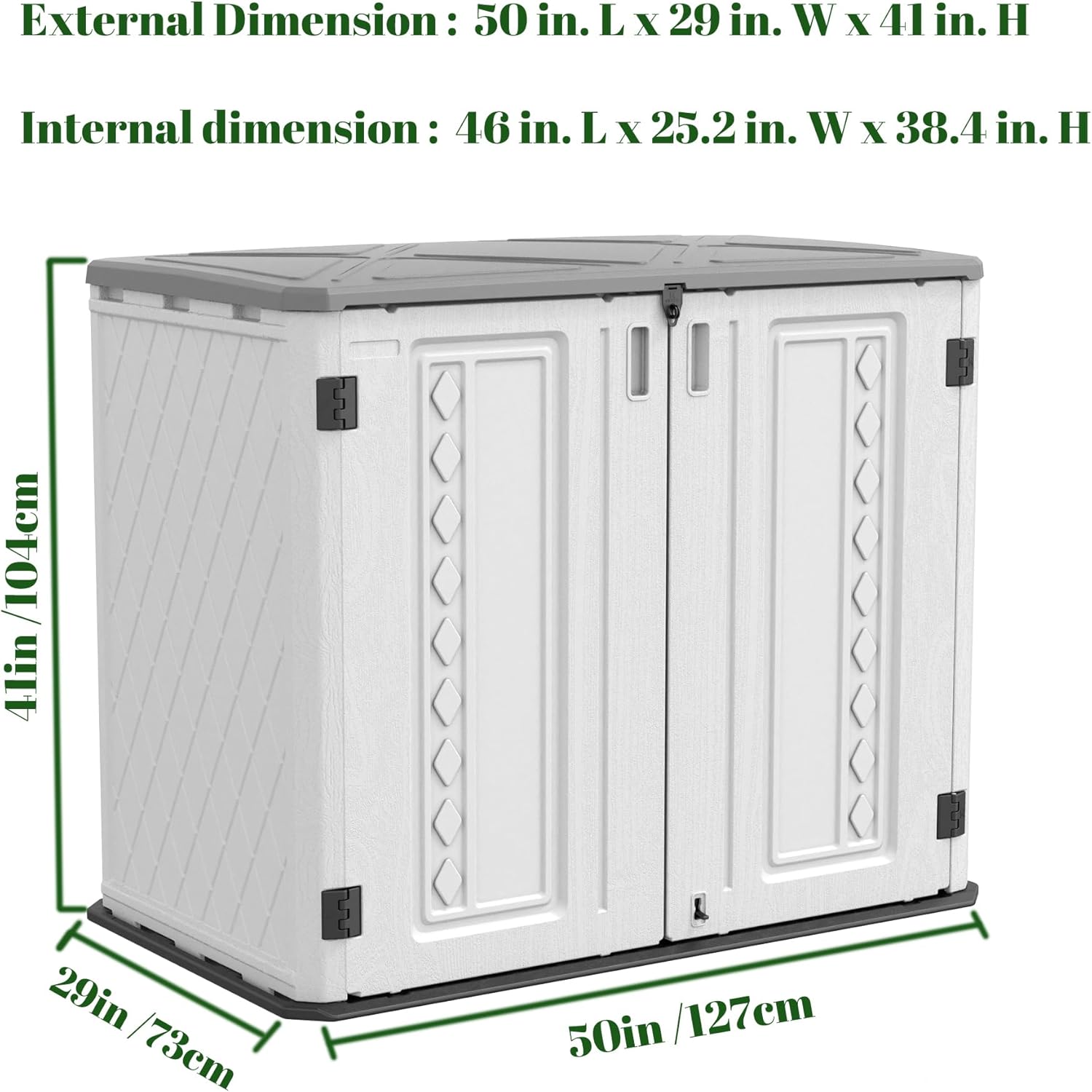 - 【IDEAL SIZE】Dimension: 50 in. L x 29 in. W x 41 in. H / Generous capacity of 27 cubic feet, enough room for a variety of items, such as garden tools, lawnmower, trash cans, patio accessories.For the purpose of special large items storage, you can measure in advance.
