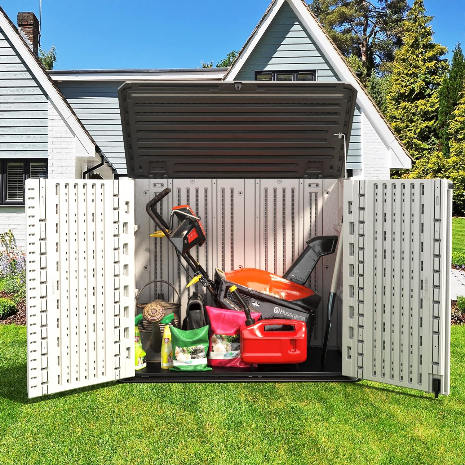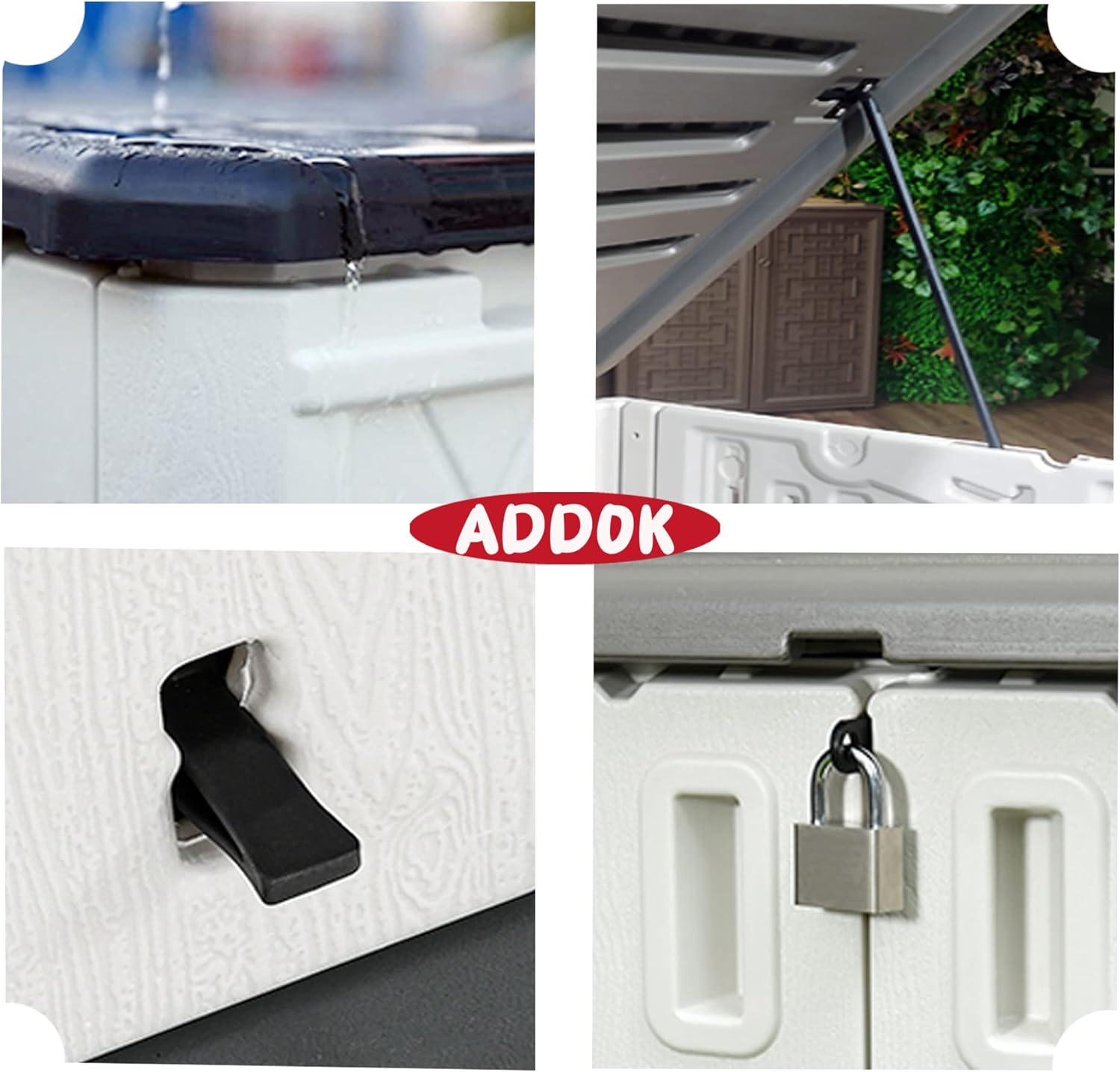 - 【PERFECT FOR YOUR NEEDS】ADDOK Storage Sheds are made of all weather-resistant HDPE resin which is suitable for outdoor use. it can also be locked to keep your tools safe. No matter placed indoor or outdoor, it will be perfect for storing garden tools, BBQ grills, firewood, seat cushions and two - 32Gal trash cans, swimming pool accessories, etc.