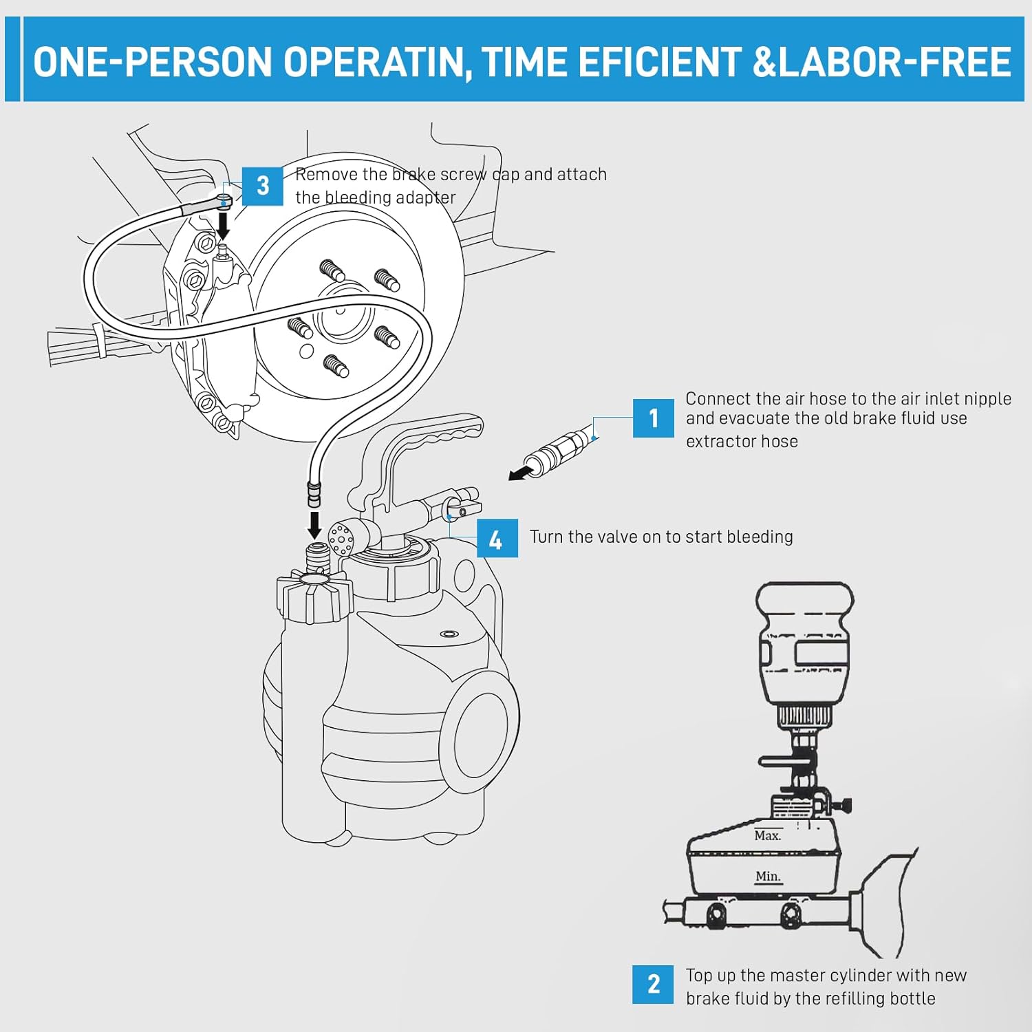 - [Large Capacity Reservoir] Equipped with a 4-liter (approximately 1.06 gallons) brake fluid extractor and a 1-liter (approximately 0.26 gallons) refill bottle, our system ensures you have sufficient capacity to handle hydraulic systems. With two 62-inch bleeder tube and a 102-inch extractor hose, it caters to most standard ABS brake systems, providing a wider range of applications.