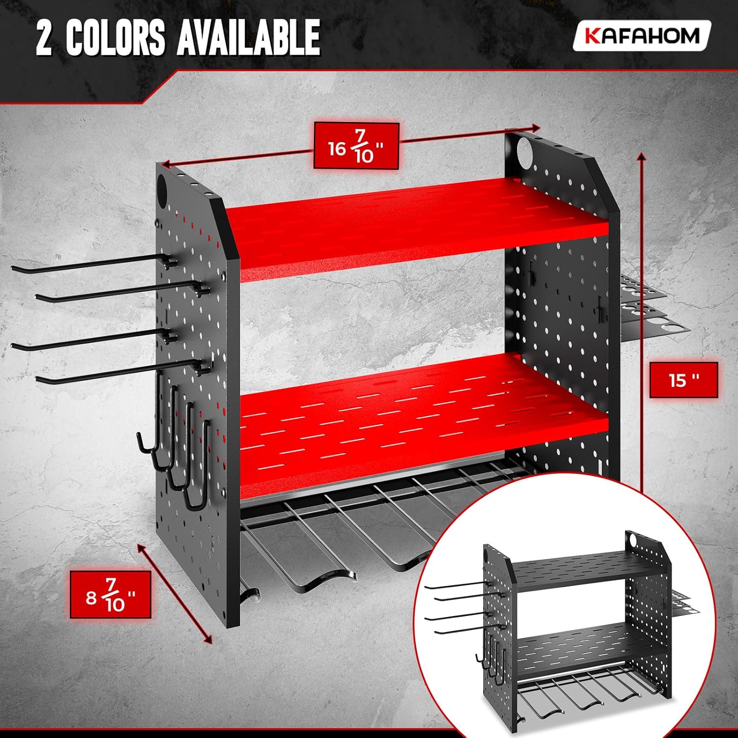 KAFAHOM Power Tool Organizer for Tool Storage, Drill Holder Wall Mount With 2 Side Pegboards, Metal Tool Shelf with 12 Hooks, Tool Organizers Storage Rack, Utility Cordless Drill Rack Red