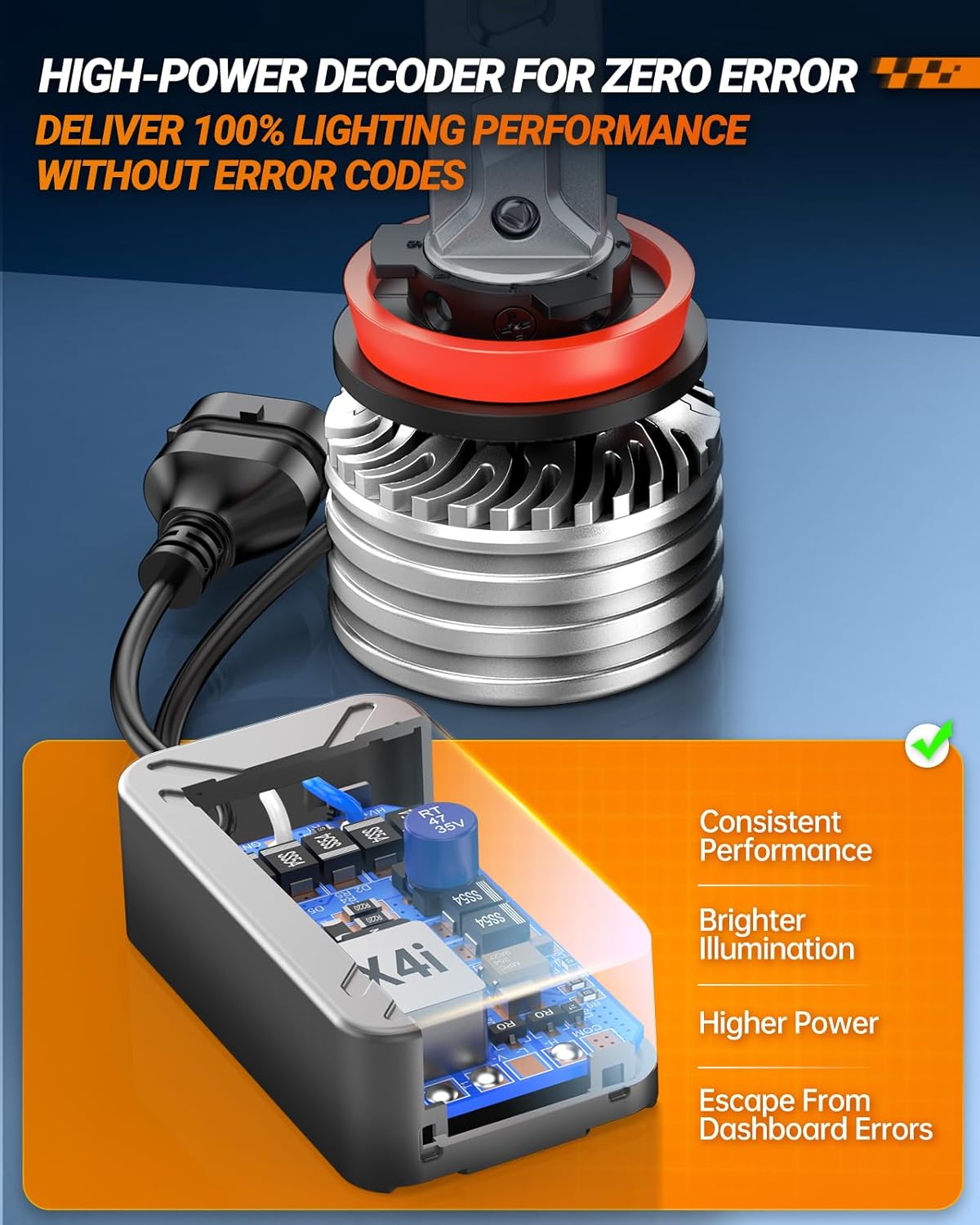 - 55,000LM Brightness: SEALIGHT X4I H11 bulbs equipped with 12 CSP chips, 55,000LM brightness and 6500K cool white, H8/H9 bulbs bring you lighting experience! Driving more safely and comfortably at night. Illuminating your way home