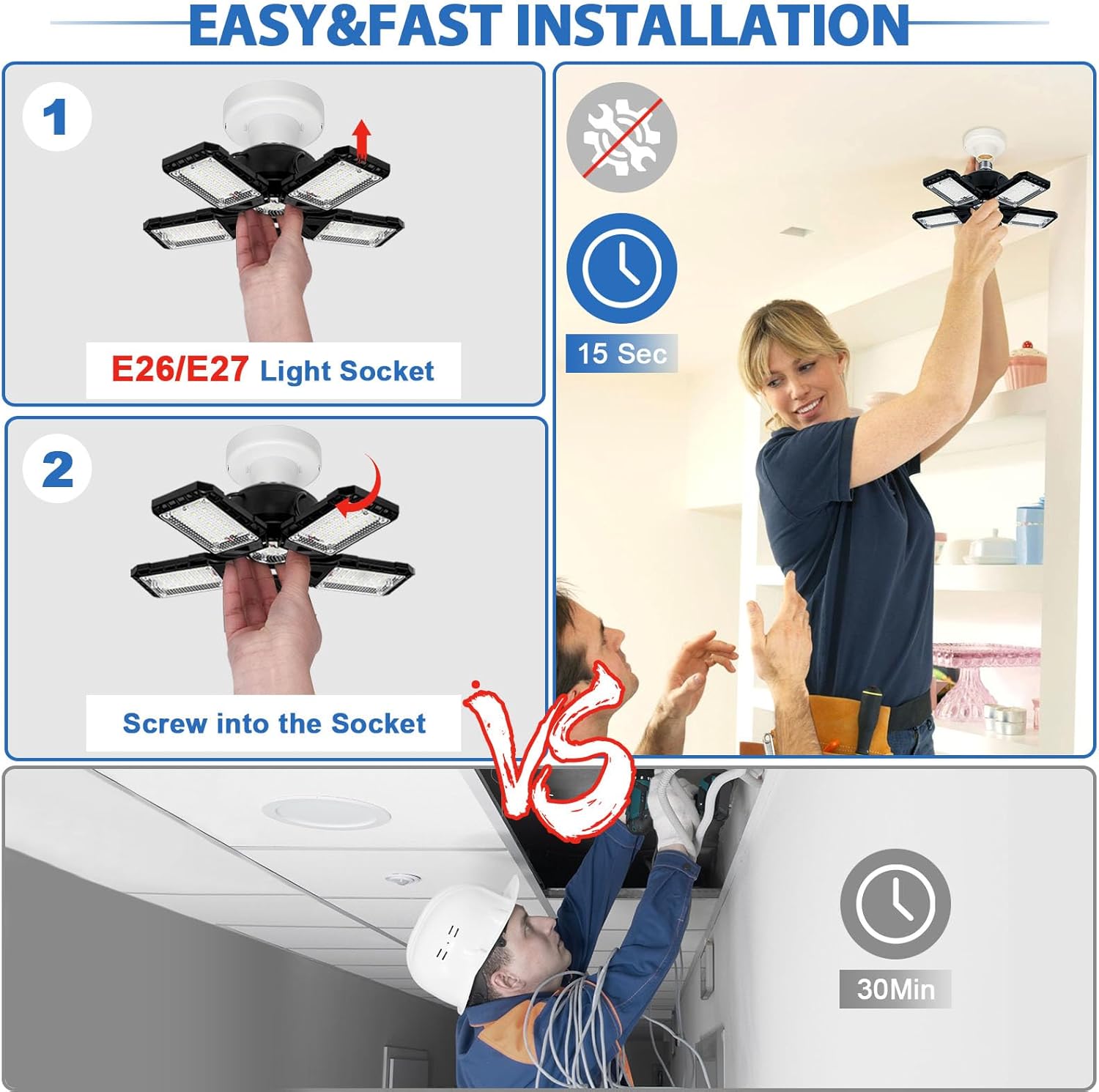 - 【Easy Installation】 Our shop lighting, garage lighting can supper fit for the E26/E27 socket, it is as simple as installing it in a ordinary a light bulb. You only needs 30 seconds for done. no need of any tools, wiring, or professional electrician. They are good led lights for shop.