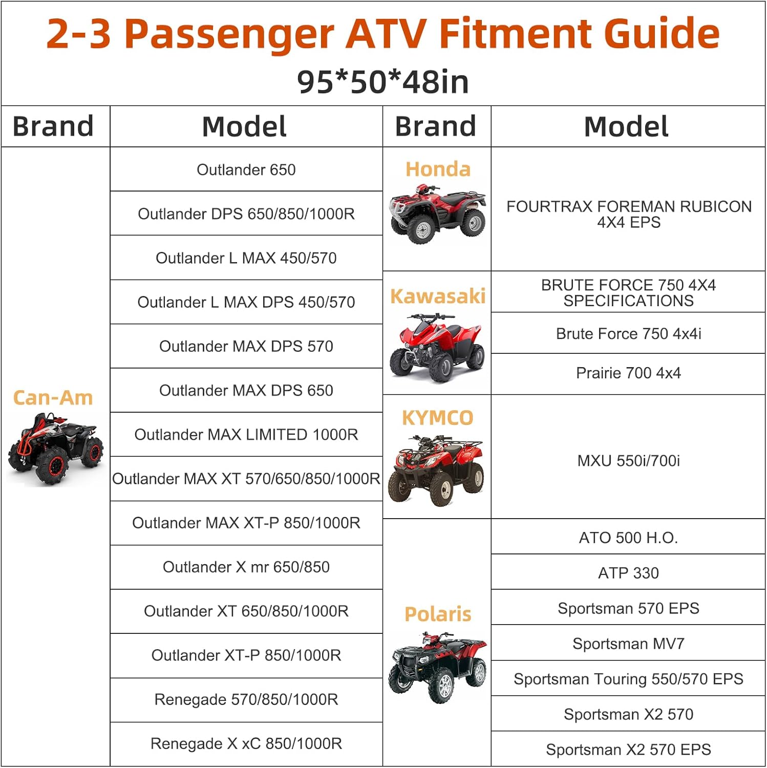 - 【Universal four wheeler Models】: The ATV cover fits the following models: Polaris Scrambler 1000, Sportsman 570/XP1000/Touring Models, Honda Rubicon, Yamaha Grizzly 700, Kodiak 700, Can-Am Outlander 570, Arctic Cat Alterra TRV 700, Suzuki KingQuad 750, and more.