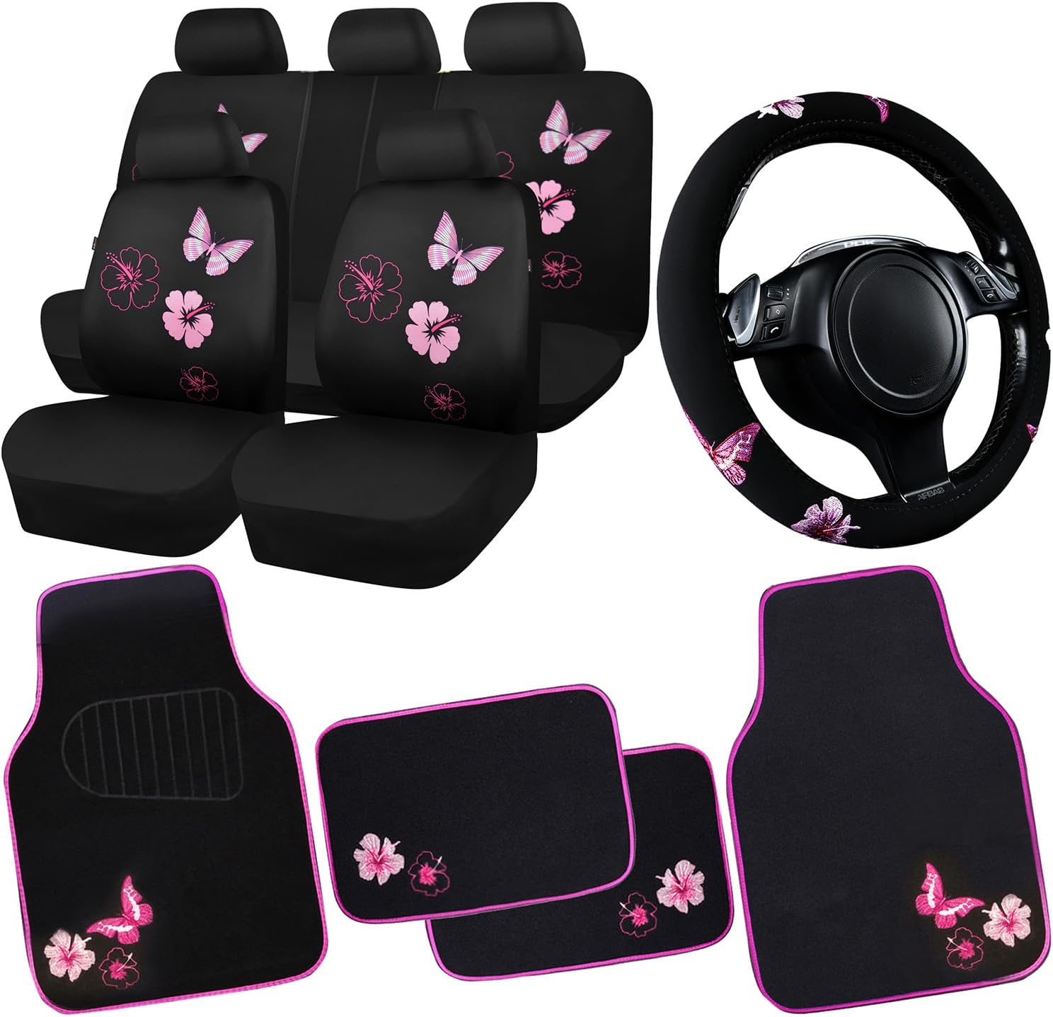 CAR PASS Universal Cloth Butterfly Car Seat Covers Full Set, Embroidered Flower Waterproof Car Floor Mats Carpet, Butterflies Steering Wheel Cover for Car Accessories Interior Sets (Black and Pink)