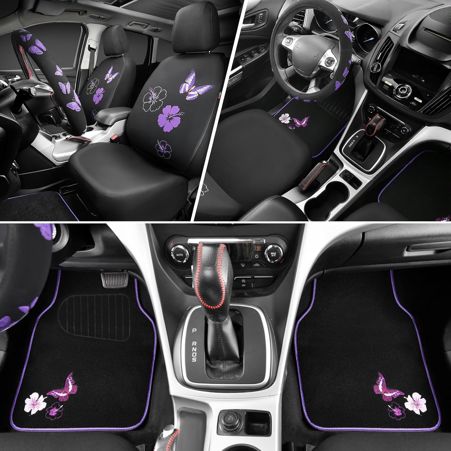 - 【Complete Car Interior Accessories】Includes a full set of butterfly seat covers, 4 butterfly floor mats and a butterfly steering wheel cover to give your car a new look.