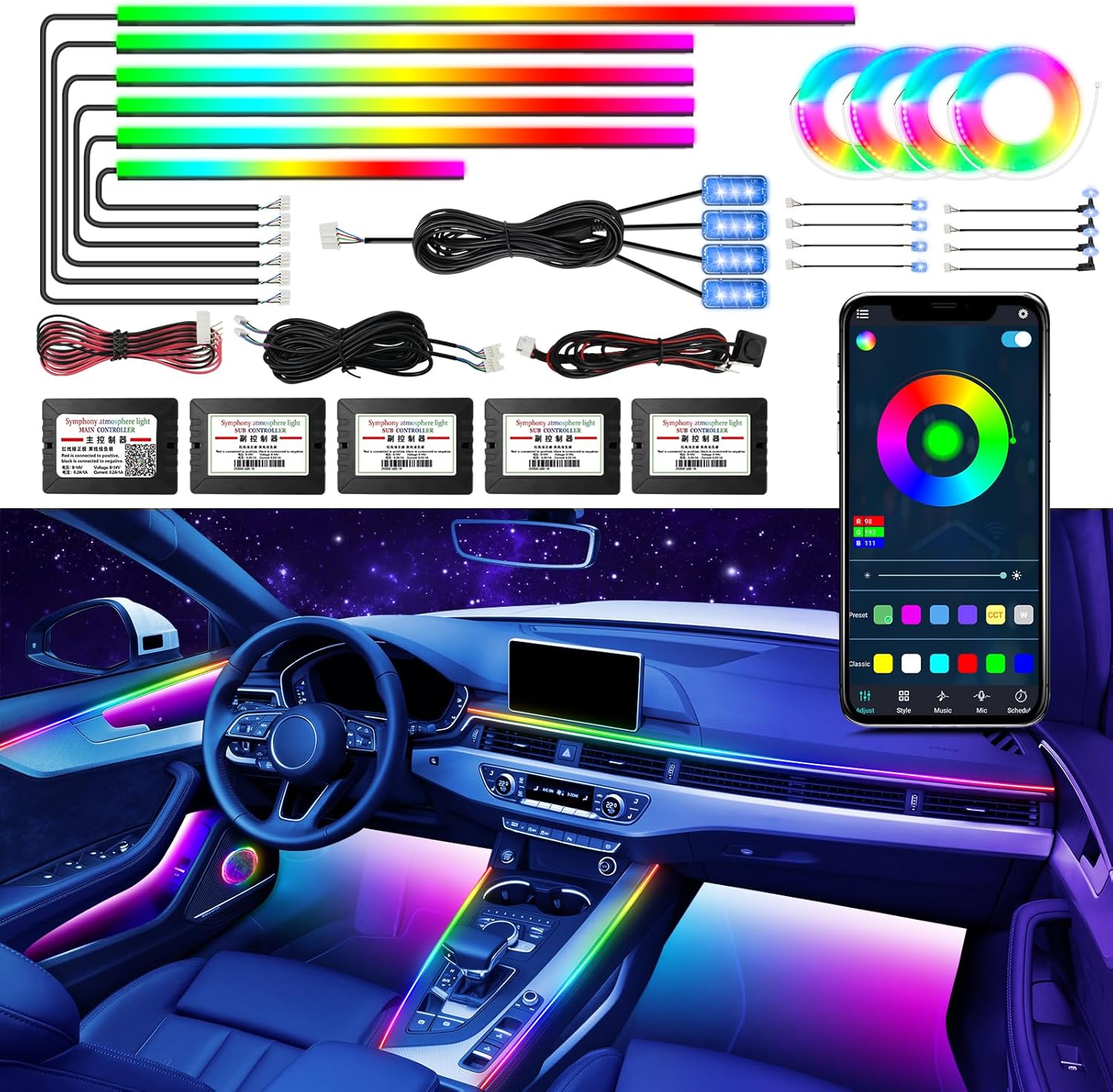 - ć Dreamcolor Car Ambient Lightć This interior car LED light consists of 6 acrylic fiber optic light strips (1*14inch+4*29inch+1*43inch, with 593 LEDs), 4 under dash lights, 4 door handle light, 4 door storage box light, 4 woofer lights, one master controller and 4 slave controller, which can be flexibly installed in any car. The dreamcolor lighting effect of the upgraded can bring you a different experience.