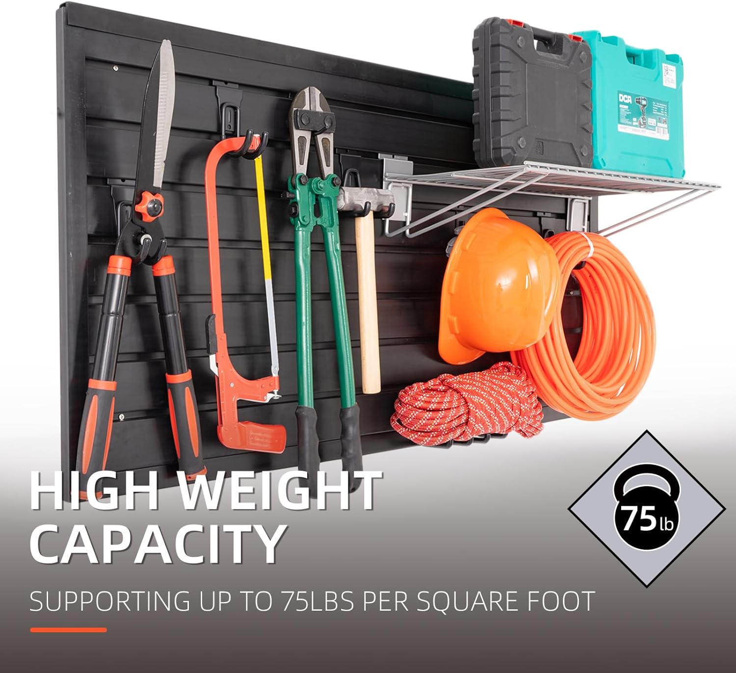 - MAKE FULL USE OF YOUR SPACE: Unleash the true potential of your garage wall organizer for tools with the garage slat wall panel. By making smart use of vertical wall space, you can revolutionize your garage into a seamlessly organized and efficient area. Bid farewell to a messy garage and welcome a meticulously optimized space that maximizes every inch available. Enjoy effortless access to your tools, equipment, and accessories, all while crafting a visually captivating environment.