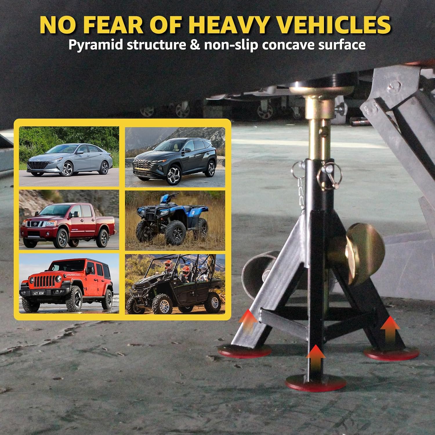 - 【Secure and Reliable】Rest assured with the confidence of a secure and reliable support platform for your vehicle. Built with a heavy-duty construction and a focus on strength, these jack stands offer dependable support, empowering you to work confidently beneath your vehicle.