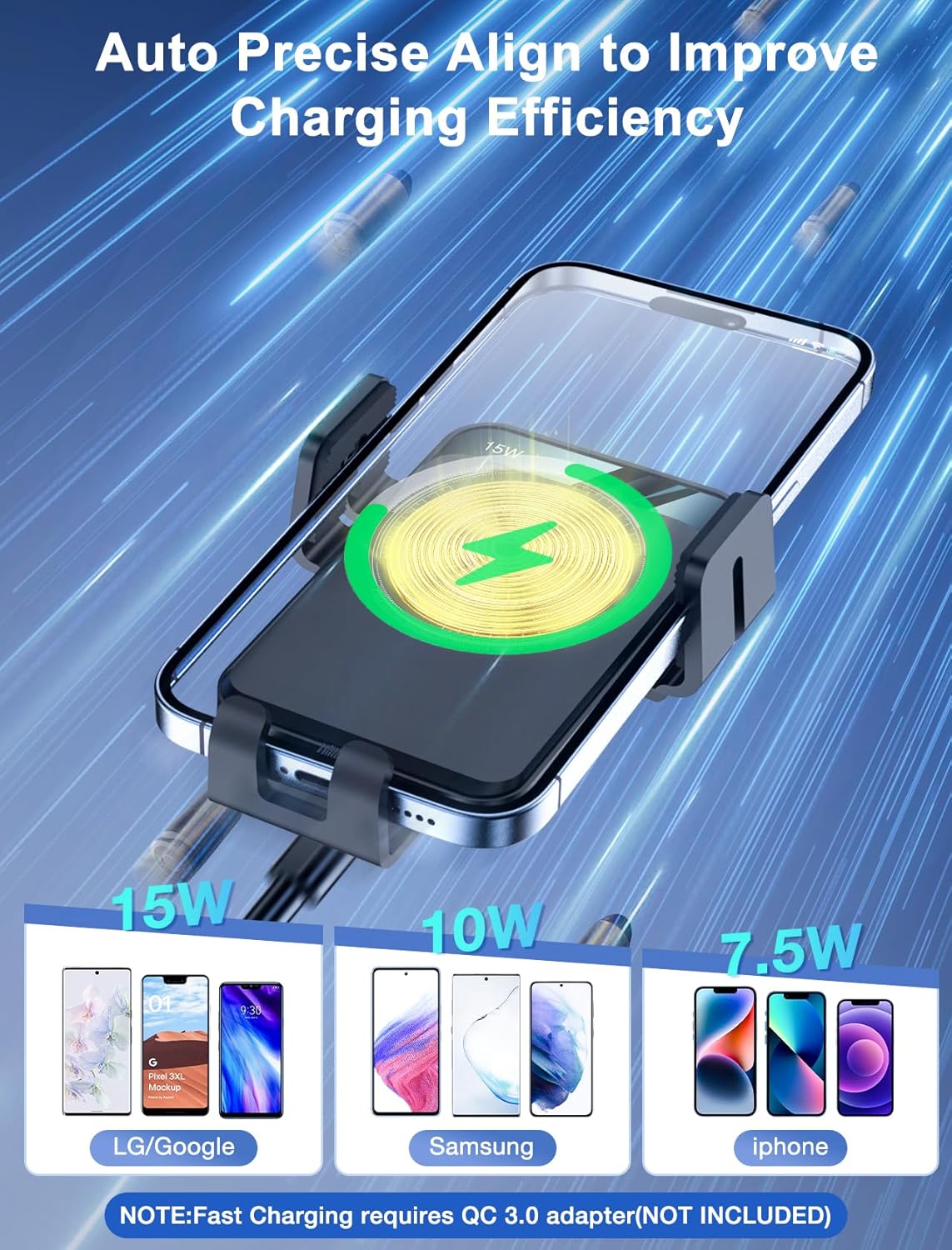 - ăWireless Car Chargeră15W Wireless Fast Charging for LG V50/V40/V30/G8/G7; 10W for Samsung Galaxy S23 Ultra/S23+/S23/S22 Ultra/S22/S21/S20/Note 20/Note 10+/Note 10; 7.5W for iPhone 16 15/14/14 plus/14 pro/14 pro max/13/13 Pro/12 Pro Max/12 Pro/12/11 /11 Pro /11 Pro Max /SE /XS /X/XR/8 Plus/8; Note: 15W/10W/7.5W Fast Charging requires QC 3.0 car charger (NOT INCLUDED), 5W standard wireless charging for other wireless charging Phones (5V/2A adapter is required).