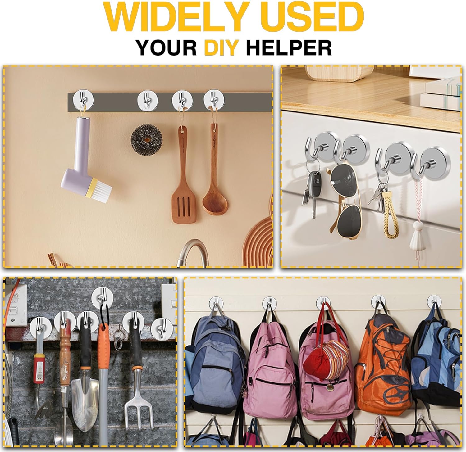 - 【Versatile Use】Super strong neodymium 118 lb magnets with hooks are perfect for hanging grill tools, decorative lights and tool accessories, also be widely used in cruise, fridge, kitchen, workplace office, garage, indoor, outdoor and anywhere there is iron or steel. No drilling holes, No sticky residue, No bolt or screws; Easy to install or remove and reusable