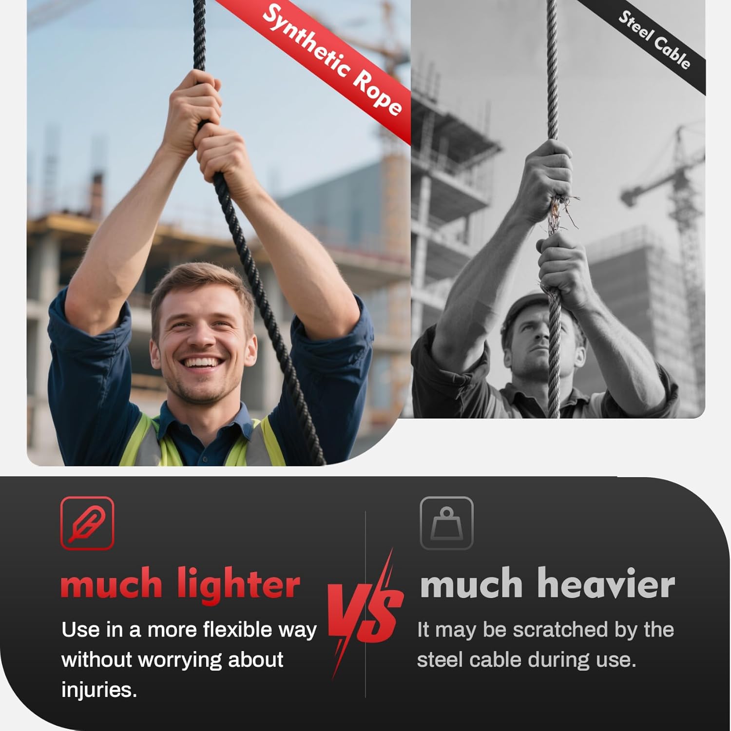 - 【Scope of Application】Compared with steel rope winch, synthetic rope winch has a wider range of applications. Compared with alloy steel wire rope, synthetic rope is not afraid of rain, snow and sea water. At the same time, the synthetic rope is softer and easier to cope with the complex environment. Because of all the advantages, the famous brand of drill winch synthetic rope is 60 dollars more expensive than alloy steel wire rope