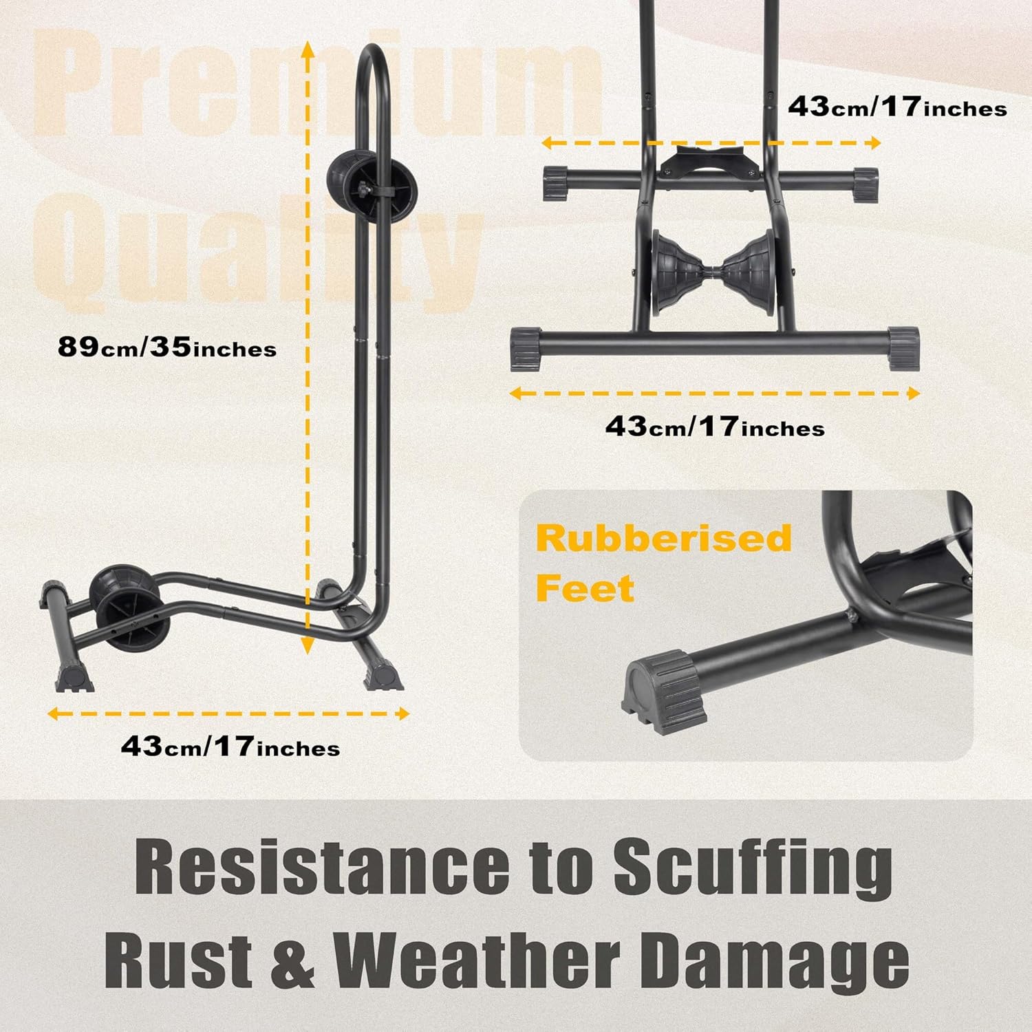 - PREMIUM DURABILITY - Crafted from powder-coated, high-quality solid steel with anti-rust coating, our bike floor stand ensures durability and stability. It resists scuffing, rust, and weather damage, ensuring a long lifespan. The rubber-protected base and precision-machined joints further enhance its stability, making it perfect for indoor use. This bike floor stand weighs 2.56 kg/5.64 lbs, providing a reliable and long-lasting solution to keep your bike safe and accessible.