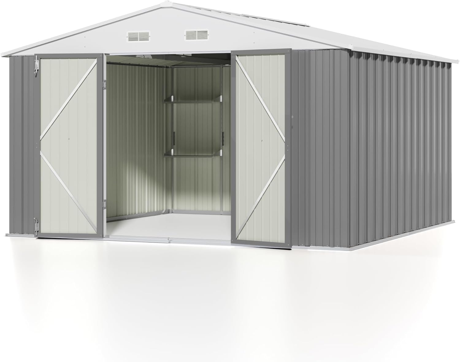 Patiowell 10 x 10 FT Metal Outdoor Storage Shed with Detachable Storage Shelves, Large Steel Utility Tool Shed Storage House with Lockable Door, Garden Tool Shed for Backyard Garden Patio Lawn,Brown
