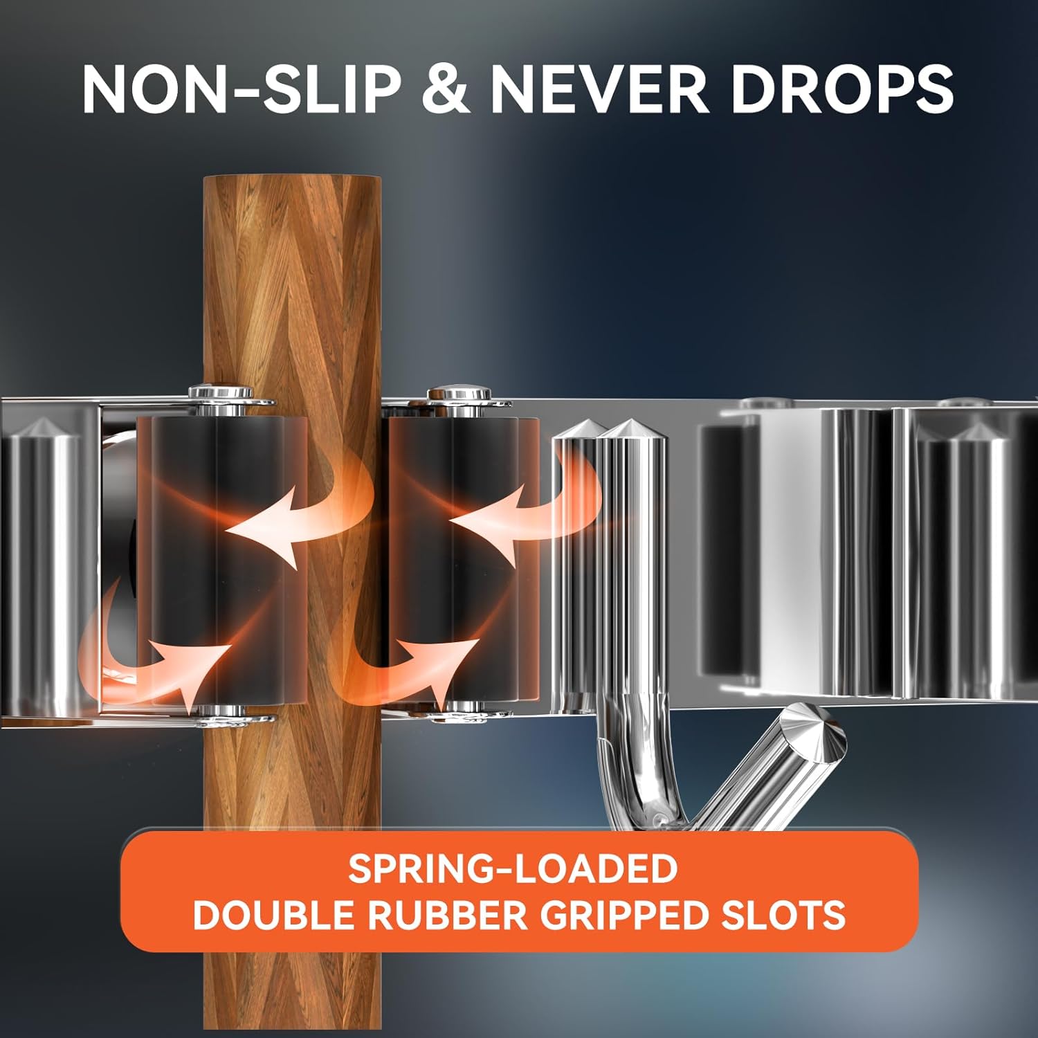- 🏡【NON-SLIDE DESIGN】Each rack of the mop and broom holder wall mount features an adjustable triangular design. The spring-loaded, double rubber gripped slots can keep a stronger hold on your items with diameter of 0.7 inch-1.3 inch. Whether wet mops or baseball bats won't slip.