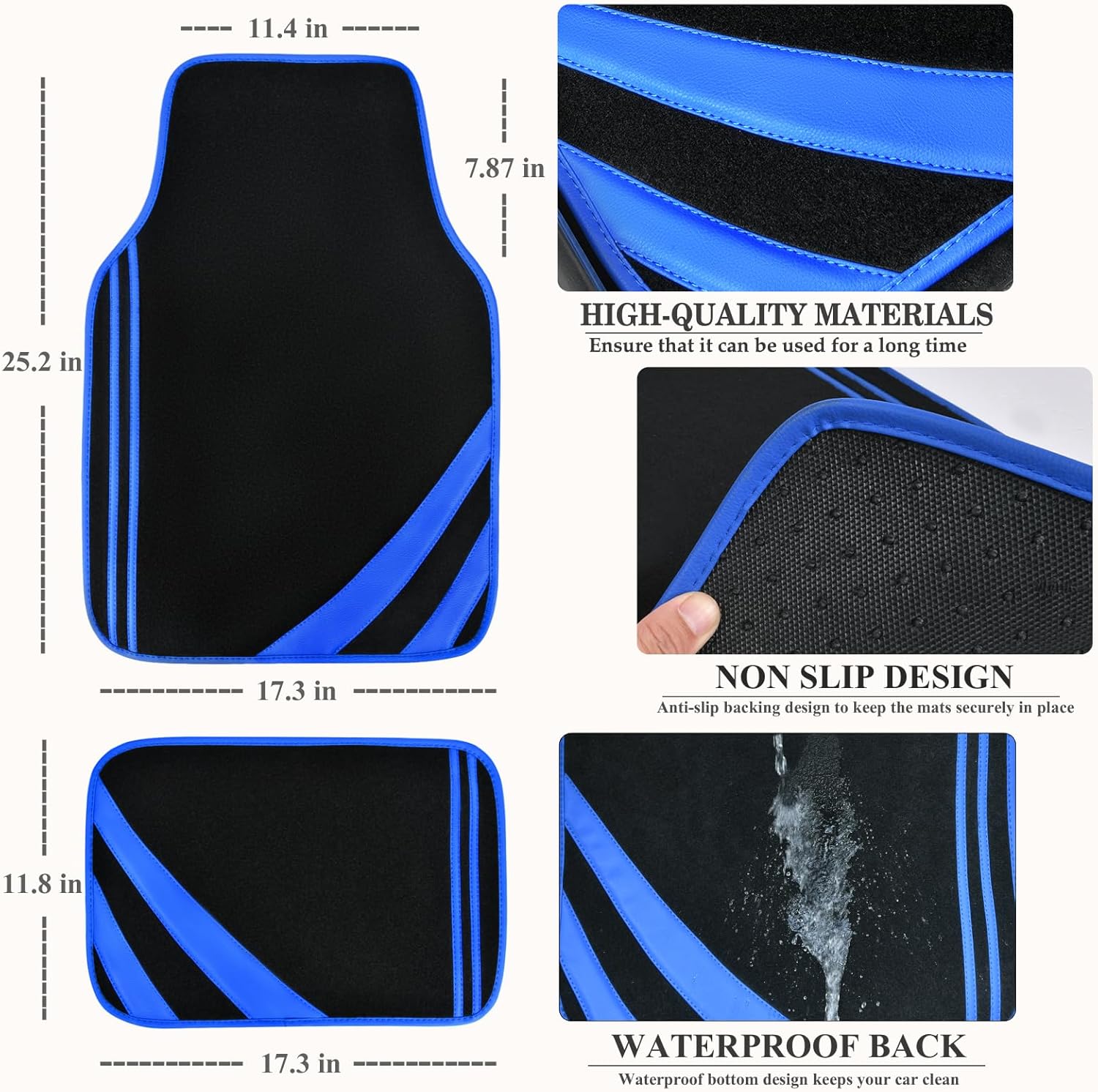 - 【Universal Fit】Shape and Size is Engineered to Fit Most Cars, Trucks, Vans and SUVs. Front (25.2"L x 17.3W) Rear (11.8"L x 17.3"W). Package Included: 2 front floor mats and 2 rear floor mats.