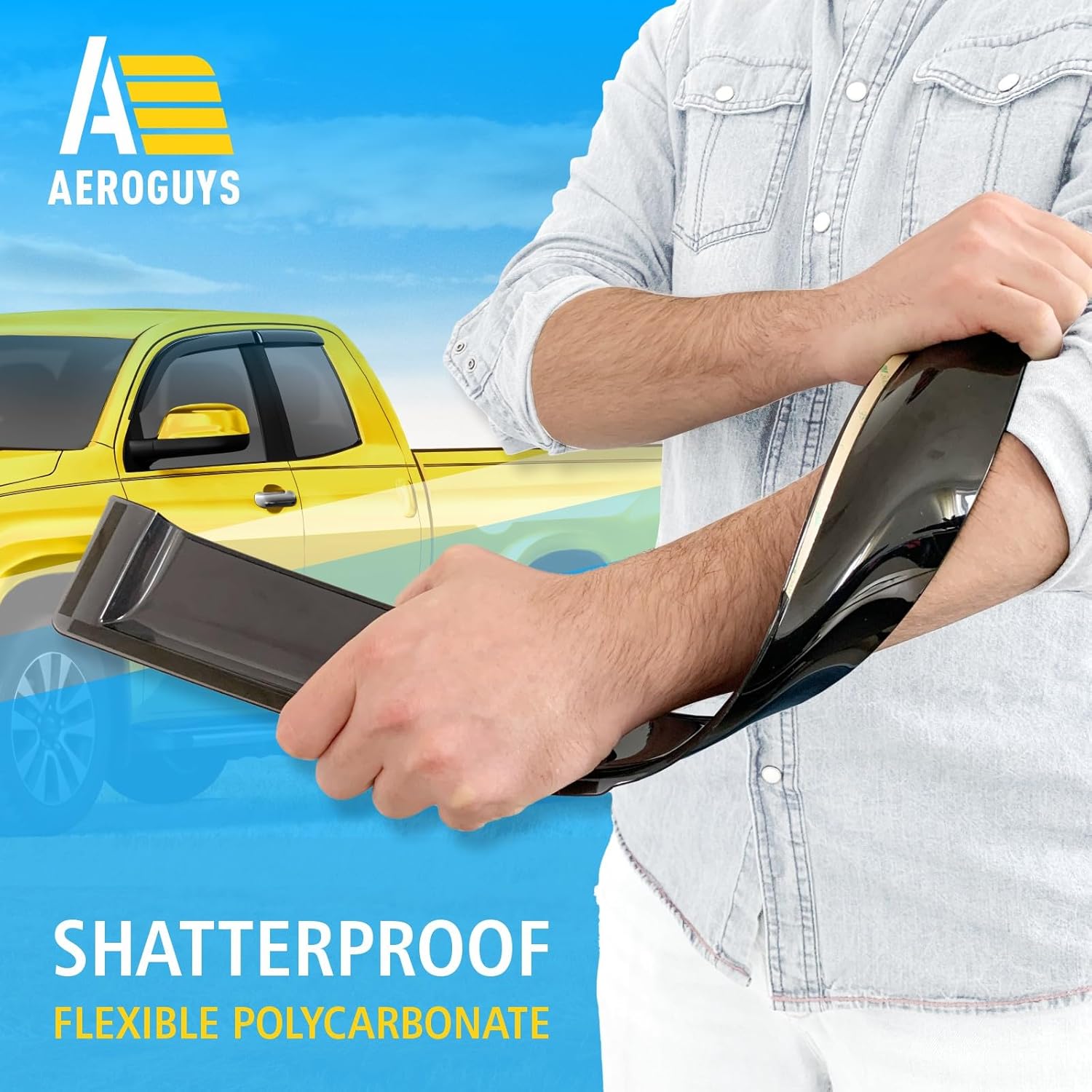 - No Tools Needed, Quick and Easy Assembly β These rain guards are very easy to fit. TAPE-ON INSTALLATION provides perfect fit for your truck. Just slip it onto your carβs window and your job is done within minutes. There is no drilling or no tools required. Be sure that AEROGUYS window deflectors are water resistant, sun protective and will not bend, break or crack regardless of the weather conditions.