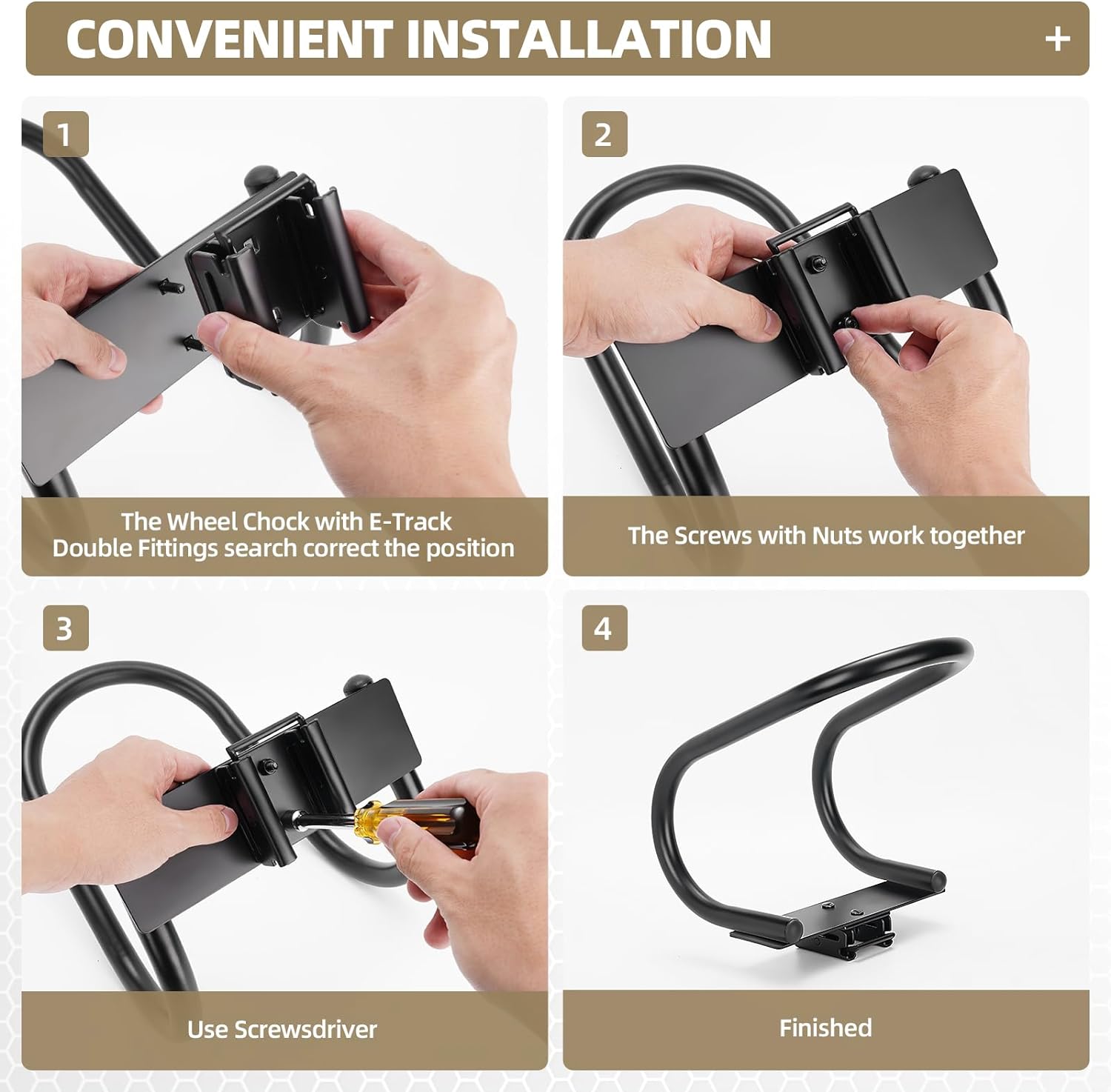 - Effortless Installation: Our motorcycle wheel chock is incredibly easy to install. Just clip it into the E-track rail slots, and you're good to go. Use the E-track wheel chocks to securely mount your motorcycle,Mount your motorcycle, dirt bike or motorcycle to E-Track rails with motorcycle chock for E-Track.