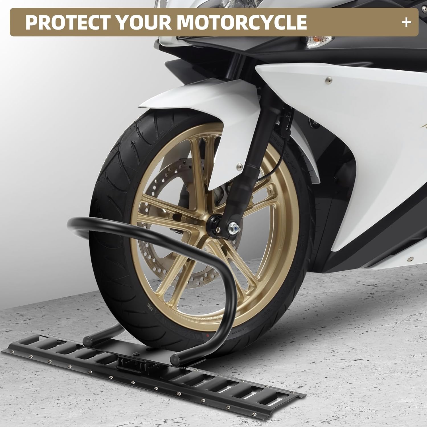 - Built to Last: Crafted from robust, powder-coated steel, this heavy-duty motorcycle front wheel chock is built to withstand the test of time. It can be adjusted to fit tires ranging from 6 to 8 inches wide, accommodating a variety of motorcycles. Its sturdy construction makes it ideal for both E-Track.