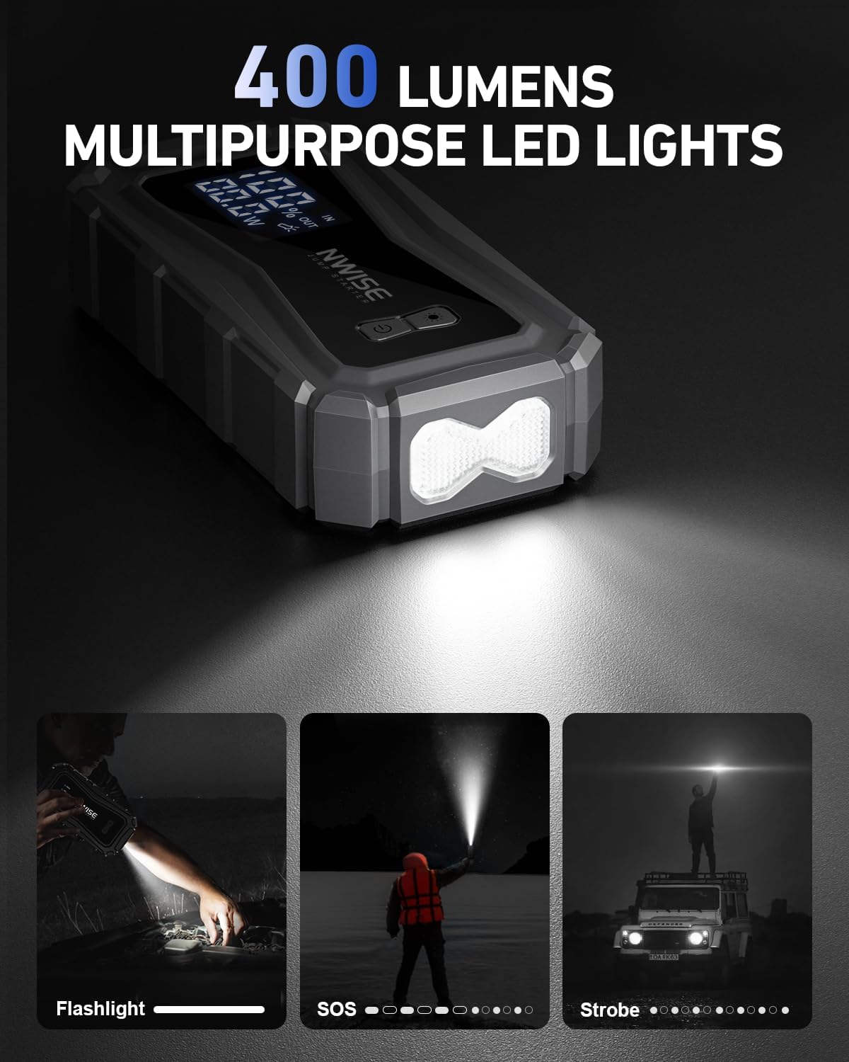 - ăMore than a Jump BoxăSJ-70 jumper pack equip super bright LED light which support 3 modes(Solid,Strobe , SOS). It is useful in many situations, such as checking for engine failure at night, outdoor adventures / accidents, calling for help, warning of other vehicles, etc.