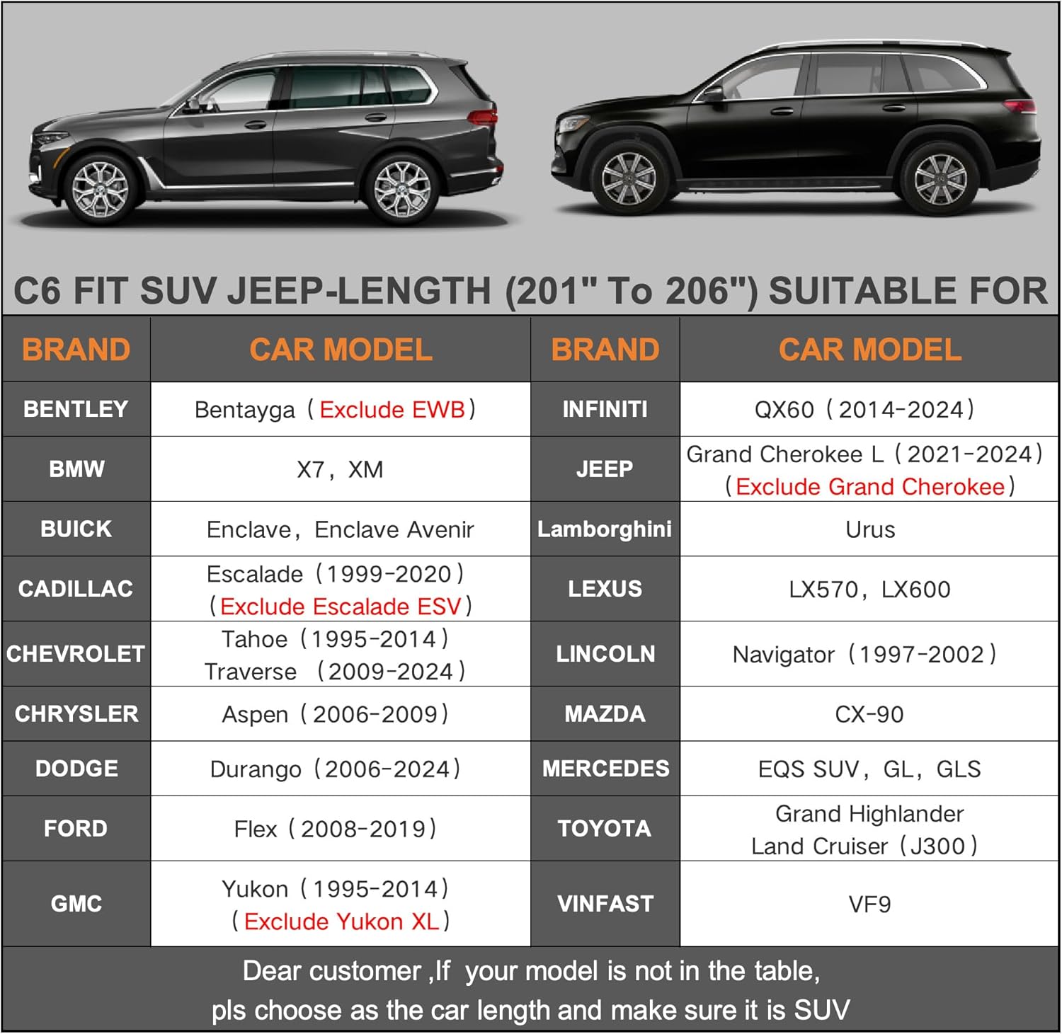 - ăDimension C6ăUniversal fit for Suv which length is 201-206 inch (Not for hatchback and sedan). Suitable for BMW X7, Buick Enclave, Lexus LX570, Mercedes-Ben GLS etc.