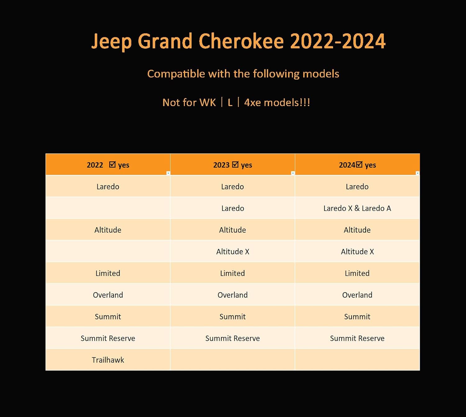 - ăAnti-slip DesignăFloor mat for 2023 Grand Cherokee are fixed with buckles on the back, so the mat always stay in place, which gives your foot more traction & comfort. The Binmotor floor mats promise you a safer and perfect driving experience.