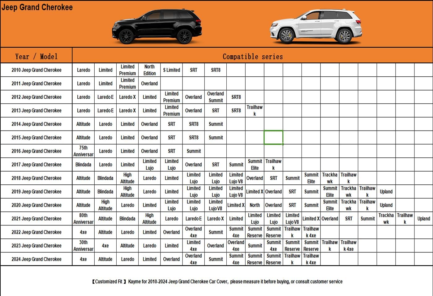 - ăSuitable forăâ Custom fit for Jeep Grand Cherokee (2010-2025). Come with a large enough portable bag to store your cover when you do not use