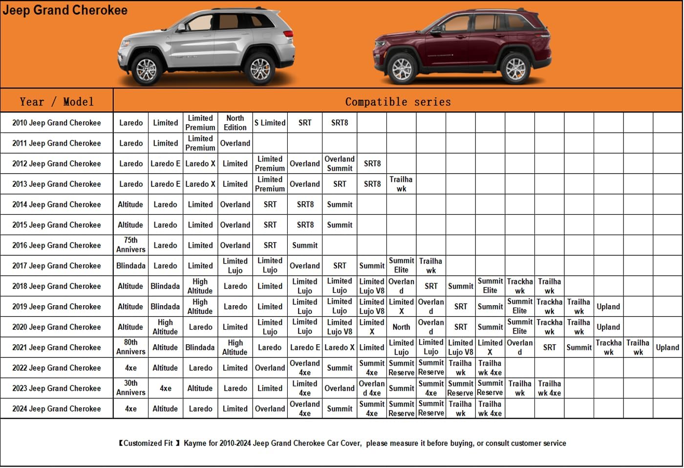 - ăSuitable forăâ Custom fit for Jeep Grand Cherokee (2010-2025). Come with a large enough portable bag to store your cover when you do not use