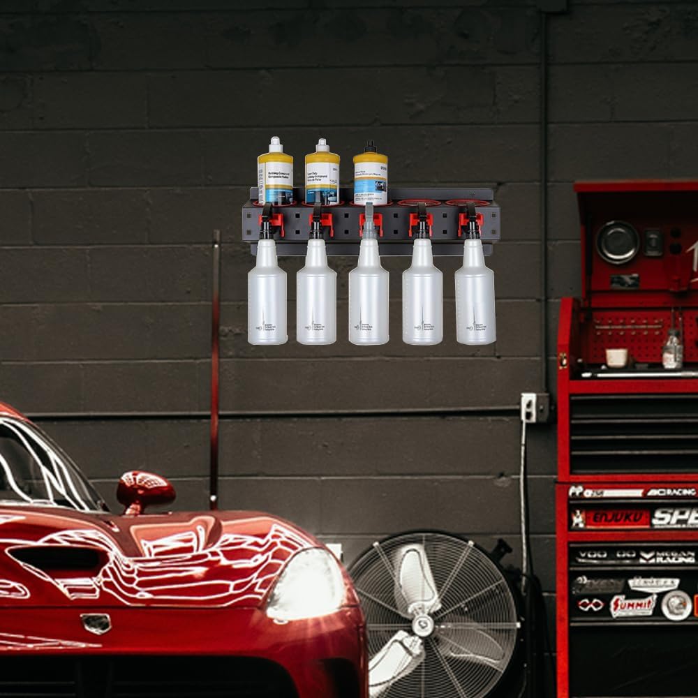 - SPRAY BOTTLE WALL RACK: The 2 pack spray bottle rack storage are equipped with 10 hooks, 1 double-headed detail brush, and 1 clean cotton cloth. It basically covers the storage location of the tools used in the car wash, such as watering cans, cleaning brushes, etc. Our spray bottle rack is also equipped with a set of detail brushes to clean the gaps throughout the car. Suitable for workshops, garages and car accessories shops.