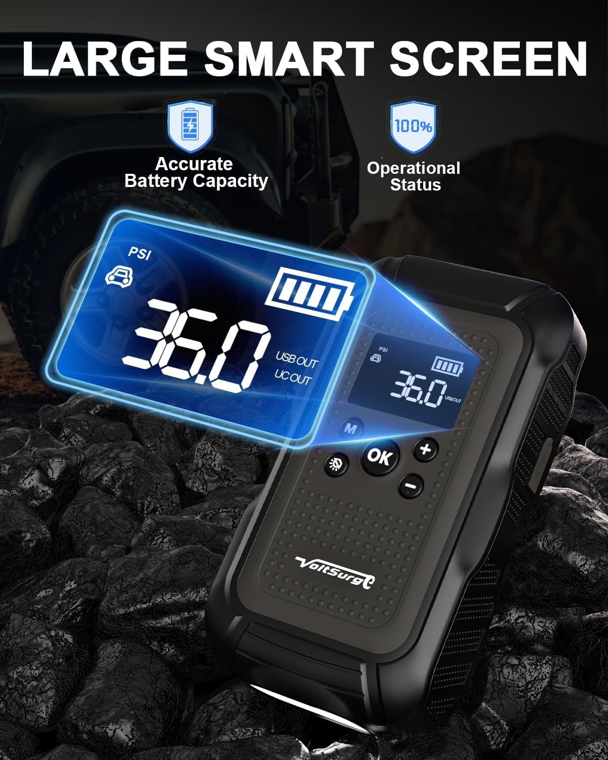 - ăWhat You Will Get & WarrantyăVoltSurge Jump Pack (1*Jump Starter with Air Compressor, 1*Smart Jumper, 1*Air Pump Hose, 3*Gas Nozzle, 1*USB-C Charging Cable, 1*DC Cigarette Lighter Adapter, 1*User Manual, 1*Portable EVA Carrying Case.) We offer a 2-year free warranty, lifetime technical support, and customer service