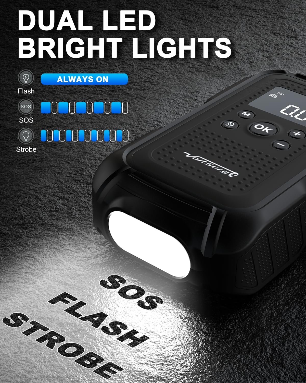 - ăIt Has 6 Functions at The Same Timeă VoltSurge D04 car emergency kit is a new R&D model, which is a new high-power inflatable all-in-one battery emergency power supply that integrates six functions such as car emergency start, tire inflator, lighting, SOS warning, mobile device charging, and starting 12V on-board equipment