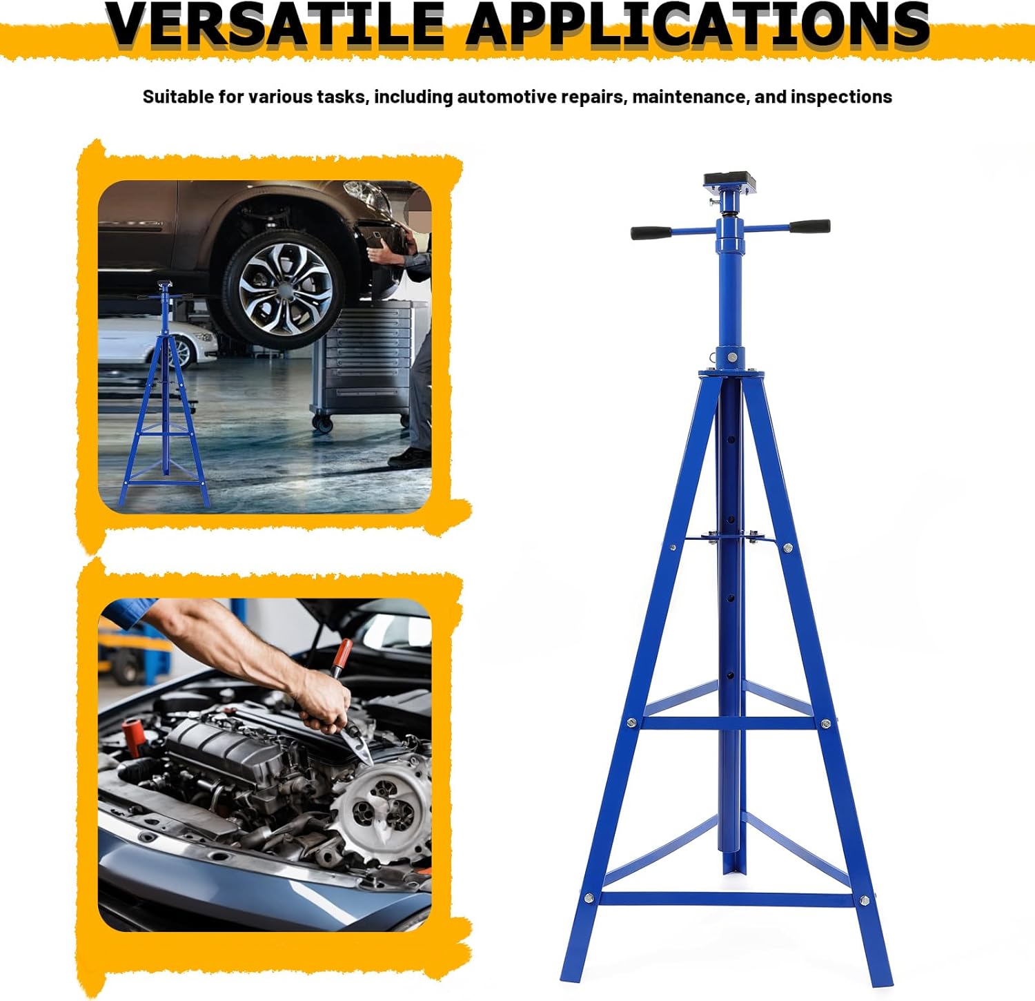 - High Performance: The tripod stand is equipped with a rotating handle mounted on the bearing, making it convenient for lifting and lowering screws. Helps to securely hold vehicle components, such as exhaust systems or transmissions, allowing for easier access and maintenance.