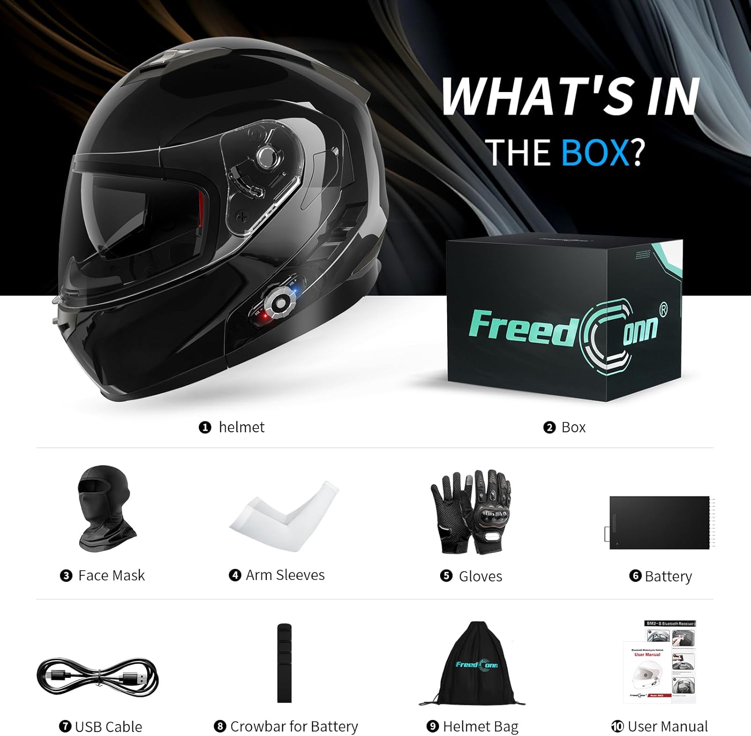 - Smart Motorcycle Helmet with Bluetooth 5.0 Built In: Upgraded Bluetooth motorcycle helmet in 5.0 version supports maximum intercom range of 1680 feet between 2 riders ( 3 can connect). One touch control button with jog dial to make hands-free calls ( Supports Siri/ S Voice), previous/ next song, FM radio, GPS guide. Enjoy personal ride or communicate with other nearby FreedConn BM2-S/ BM12 full face motorcycle helmet is quite easy and convenient.