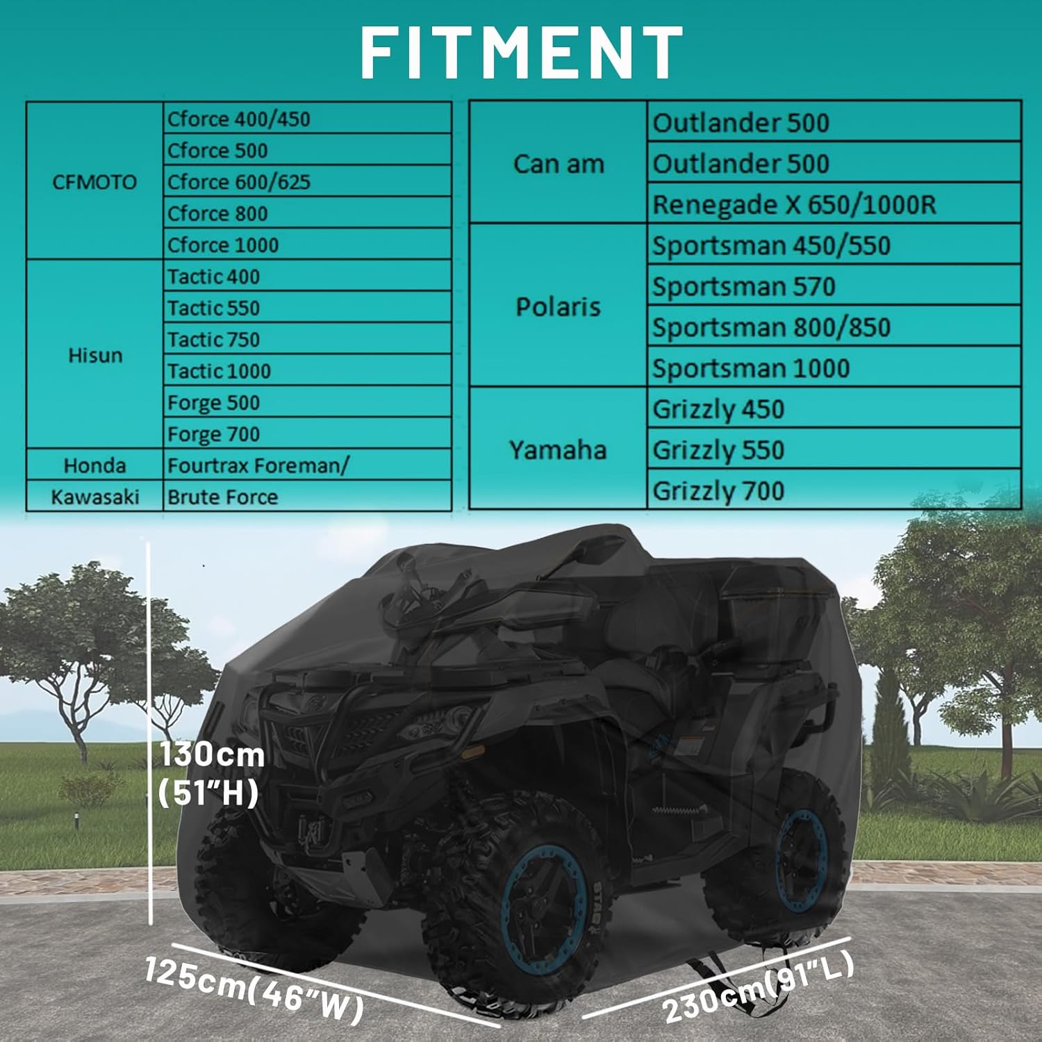 - Durable & Secure: Reinforced stitching and heavy-duty elastic hem keep it from blowing offin wind. Designed specially for 4 wheeler ATV ,It hugs the body snuggly without sagging. The dimensions (91" Lx 49"Wx 51" H) are spot-on
