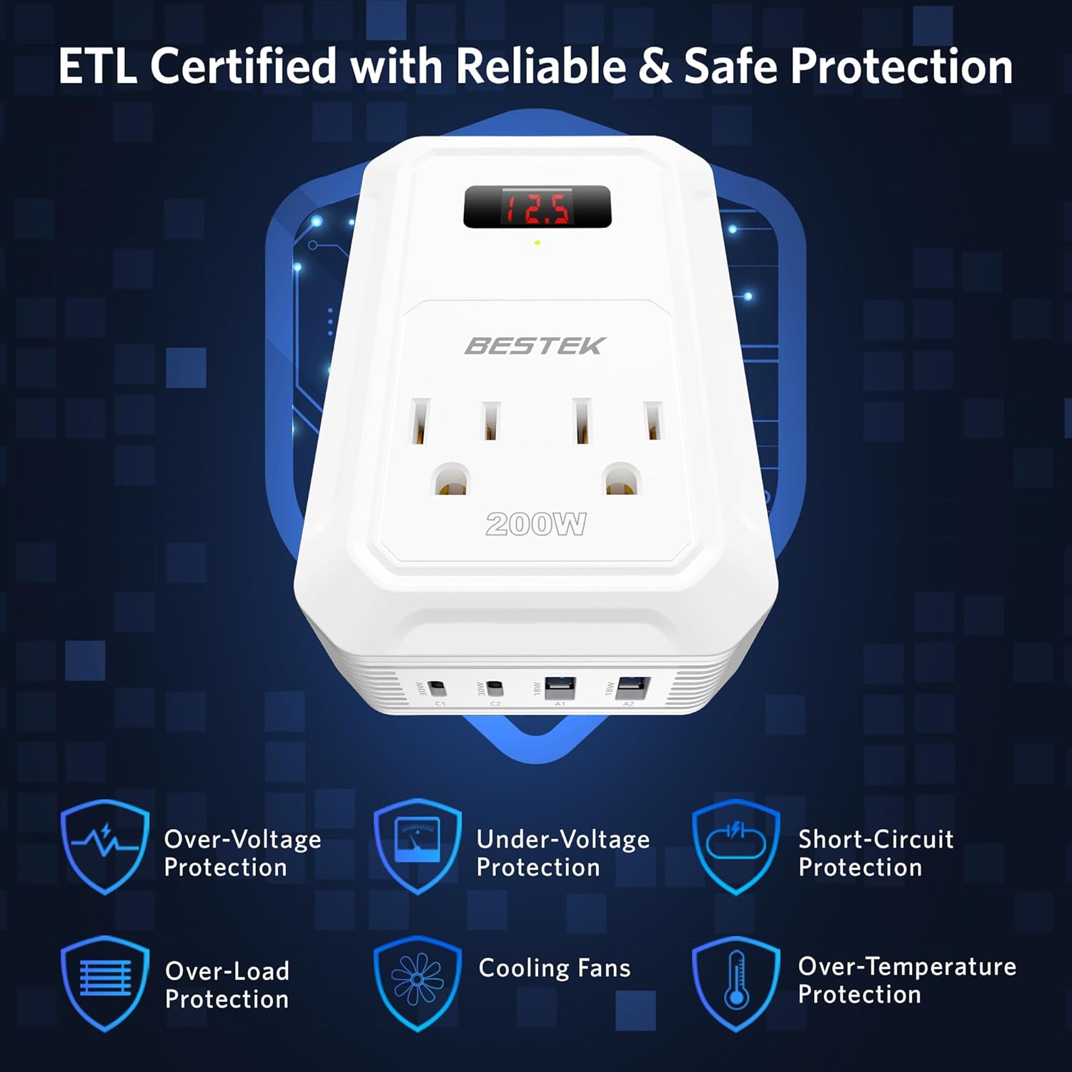 - BESTEK Advantage: America's leading power inverter brand. Provides 200 Watts continuous DC 12v to AC 110v power inverter featuring 2xPD 30W&2xQC 18W USB ports, 2 AC outlets, and a 23.8-inch cable with cigarette lighter plug and LCD Display for you, more convenient.