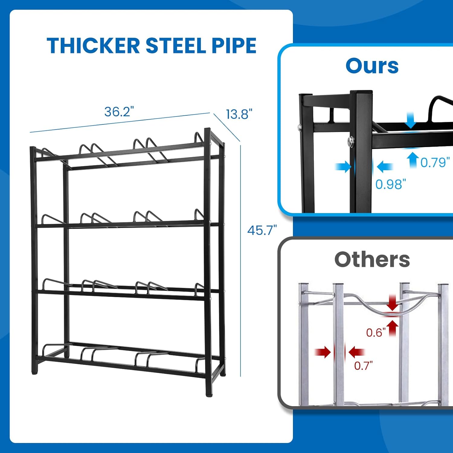 - 【STRONG LOAD-BEARING】Jolybebe water jug rack can easily hold twelve 3 or 5 gallon water bottles without wobbling while boasting a weight capacity exceeding 500 LBS for reliable storage. Each steel arms and steel beam are made of whole thickened steel pipe.