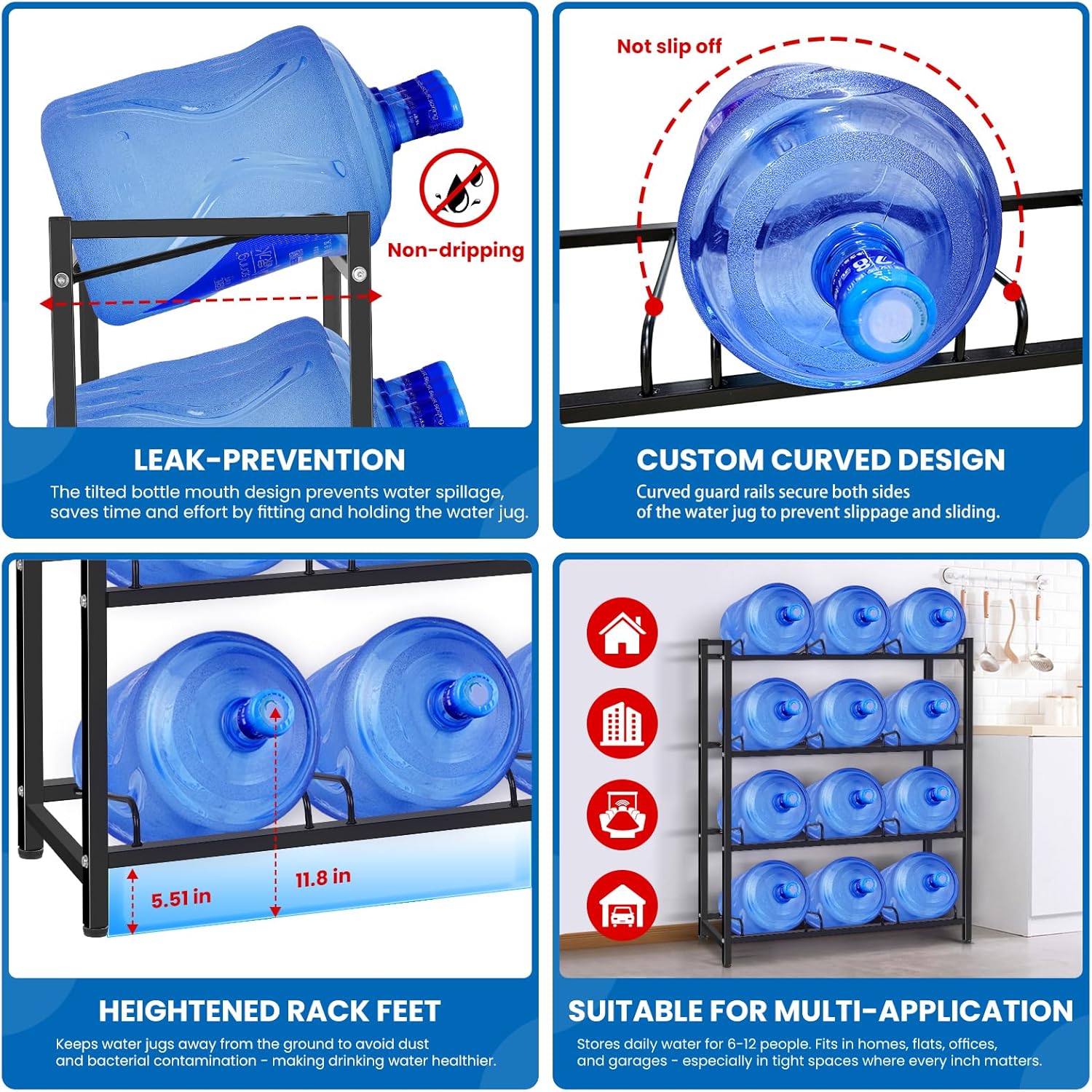 - 【VERSATILE USAGE & SAVE SPACE】Our water jug rack is the ultimate solution for maximizing your space. Can provide daily water for 6-12 people, fit in homes,flats, offices, and garages, especially in compact spaces where every inch matters.